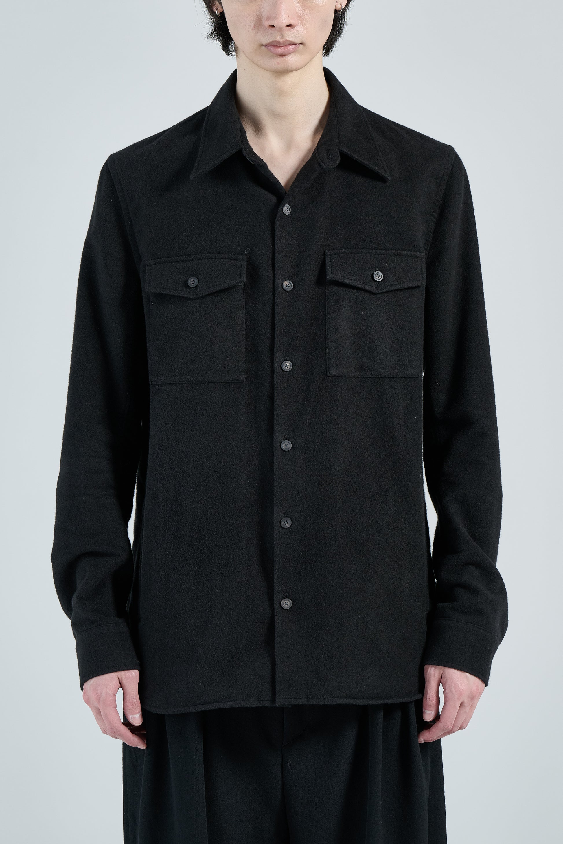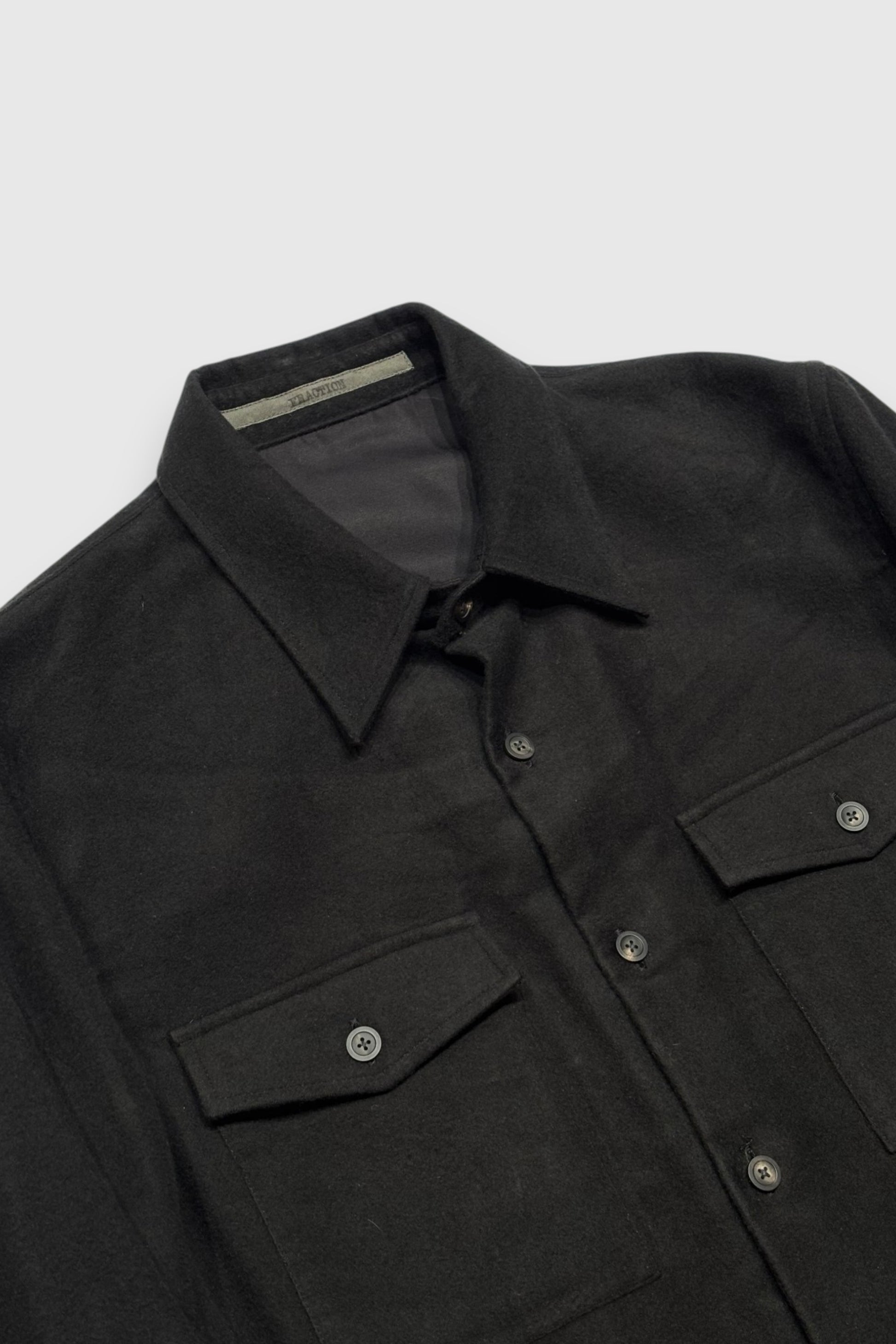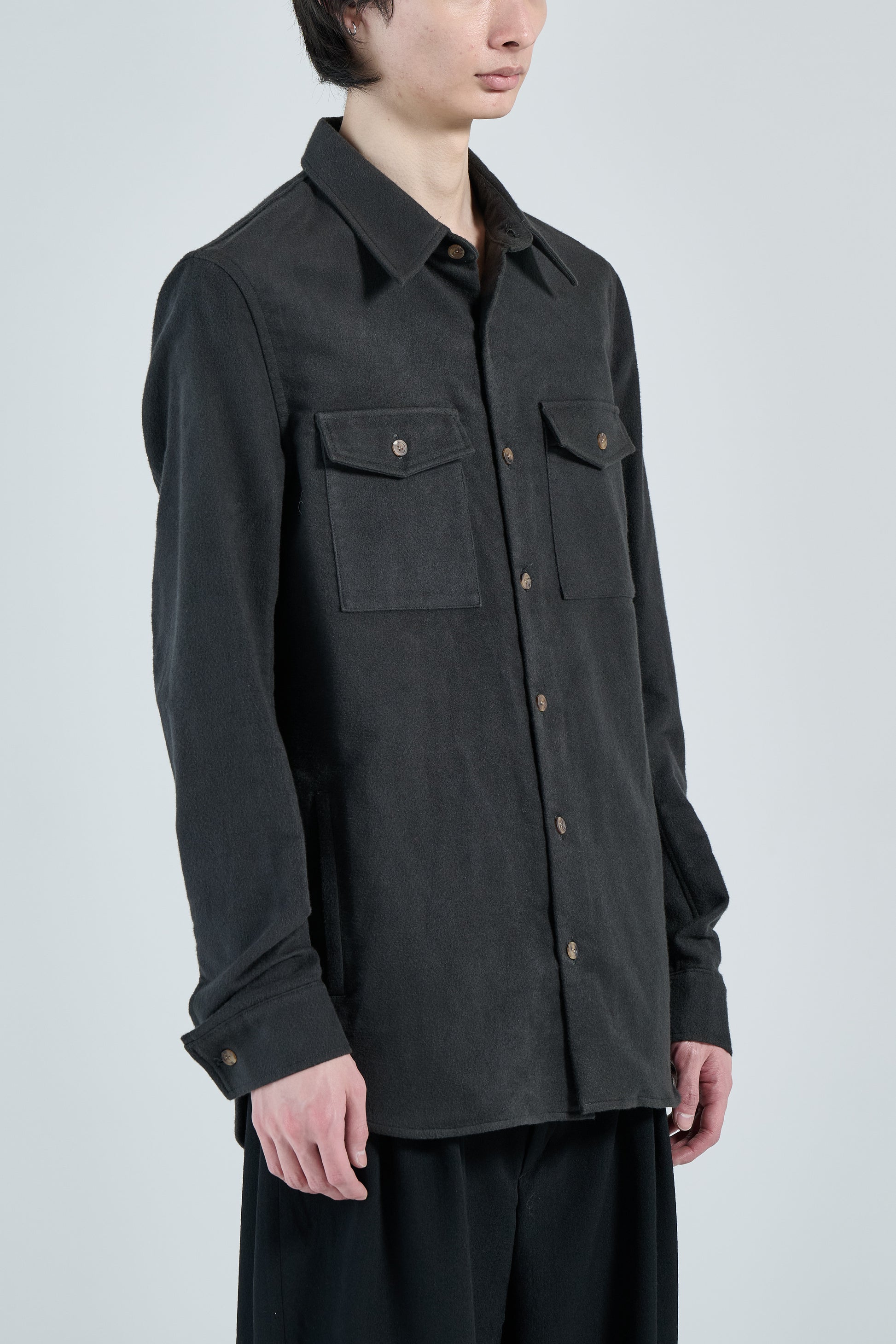アメリカ陸軍のフィールドシャツをベースに、FRACTION独自のデザインでアップデートされています。コットンシルクのフランネル生地が採用されており、柔らかく、起毛感のある素材です。分厚く耐久性のある生地で制作されており、シャツジャケットとしてもご着用していただけるアイテムです。胸にはフラップ付きのポケットが配されており、ミリタリーディティールが踏襲されています。また下部にはスラッシュポケットが設計されています。全てのボタンに水牛の角が使用されており、上品さと無骨さを兼ね備えたアイテムです。