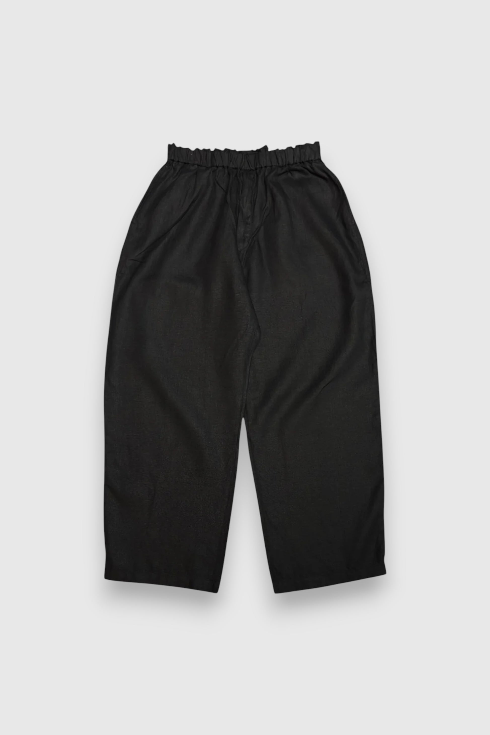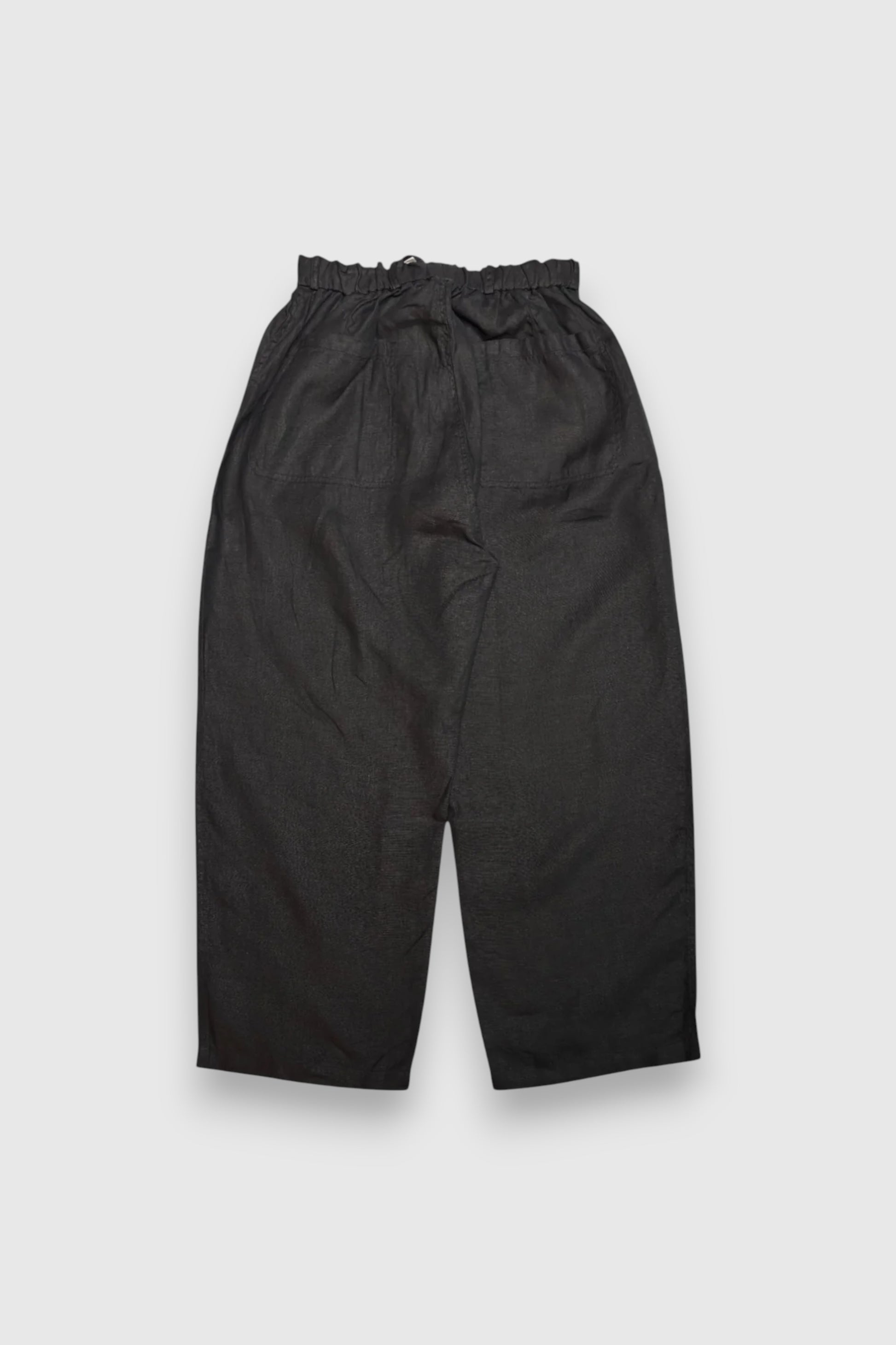 大麻100%の糸を経糸、緯糸に使用しています。大麻は強靭な繊維ですが、経年変化で肌に徐々に馴染んでゆき、麻から綿のような質感の変化が楽しめます。大麻の特性であるひんやりとした触感は洗濯を繰り返しても継続し、真夏でも快適に着用が可能です。十分に幅があり、ゆとりがありますが、シルエット自体はストレートです。非常に軽量なパンツで、ポケットの中の重さに耐えられるようベルトループが付いています。ウエストゴムと内側の紐で、ベルトを用いなくても着用が可能です。