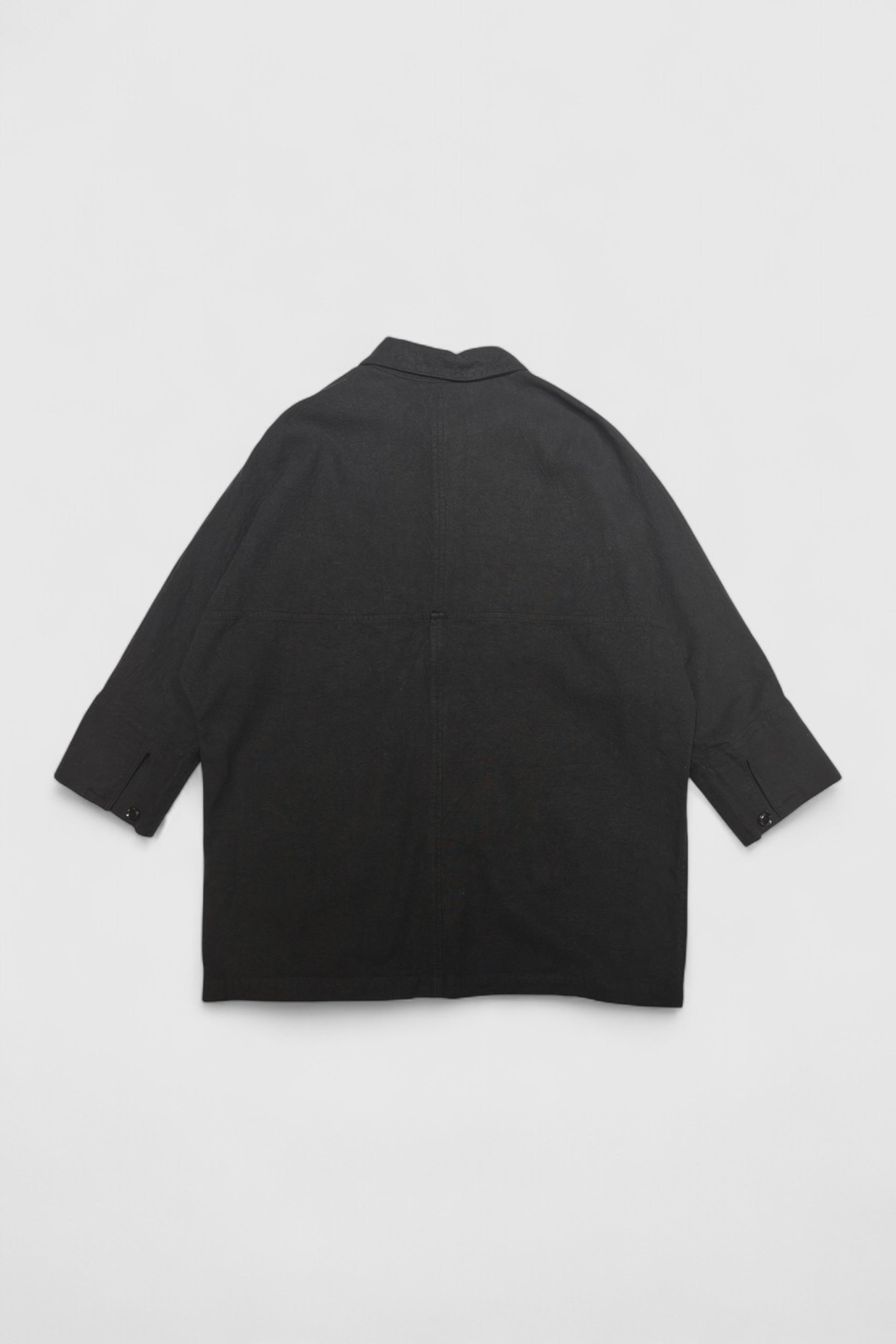 ほとんどのパーツを直線で構成した、平面的なパターン設計が特徴のコートです。袖下に裁ち続きのマチを配した、全体的にゆったりとしたシルエットで、中に着るものに左右されずに羽織ることができます。裏面のパイピングテープにはオーガニックコットンを、ボタンには環境負荷の少ないナットボタンが採用されています。