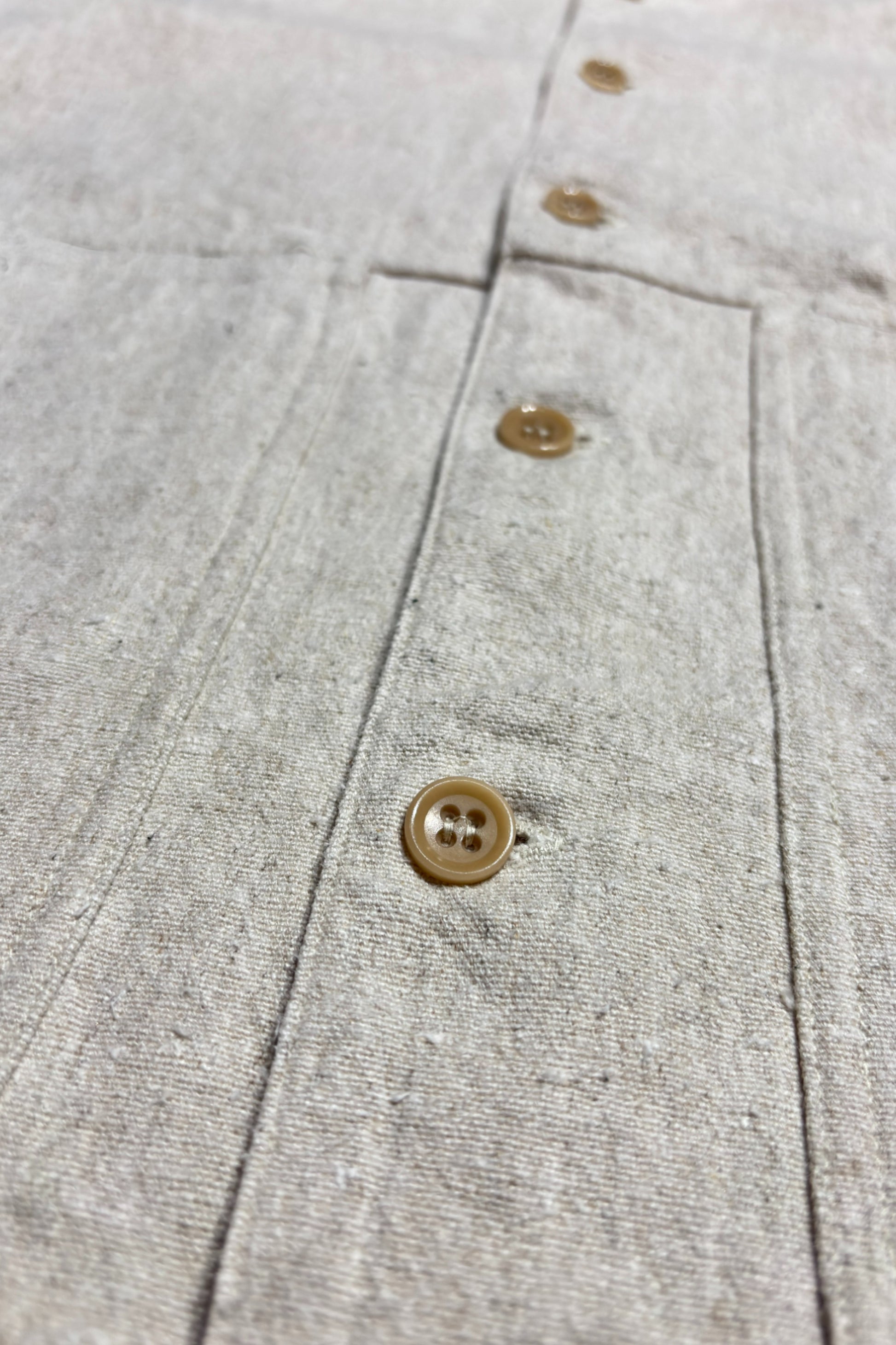 シャツとジャケットを兼ねるサイズ感とシルエットに設計されています。縦方向のポケットは、上にアウターを重ねても収納物の出し入れがしやすい位置と深さに調整され、全体を無駄のない構造にすることで日常の道具としての利便性と耐久性を備えられています。パイピングテープにはオーガニックコットンを、ボタンには環境負荷の少ないナットボタンが採用されています。