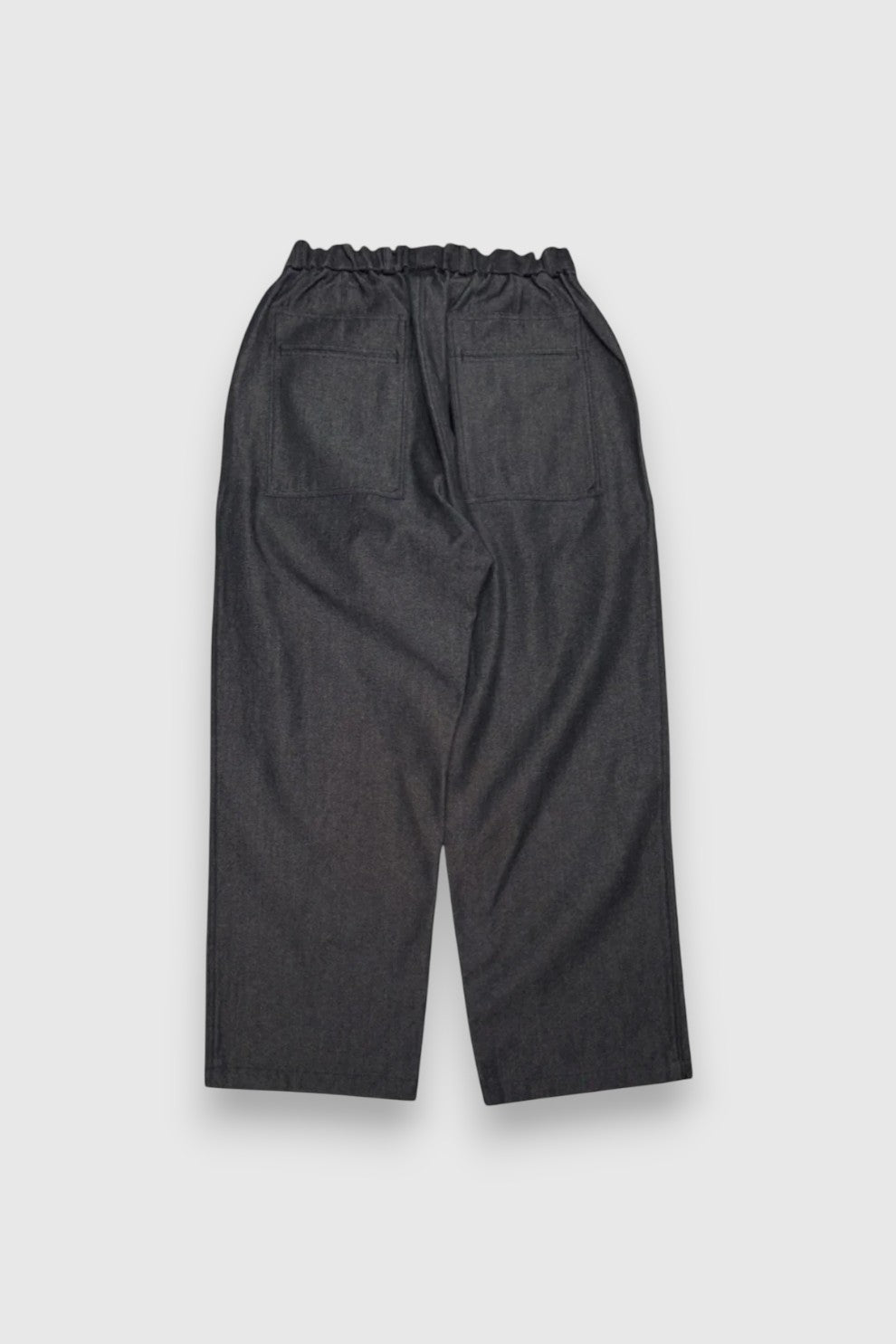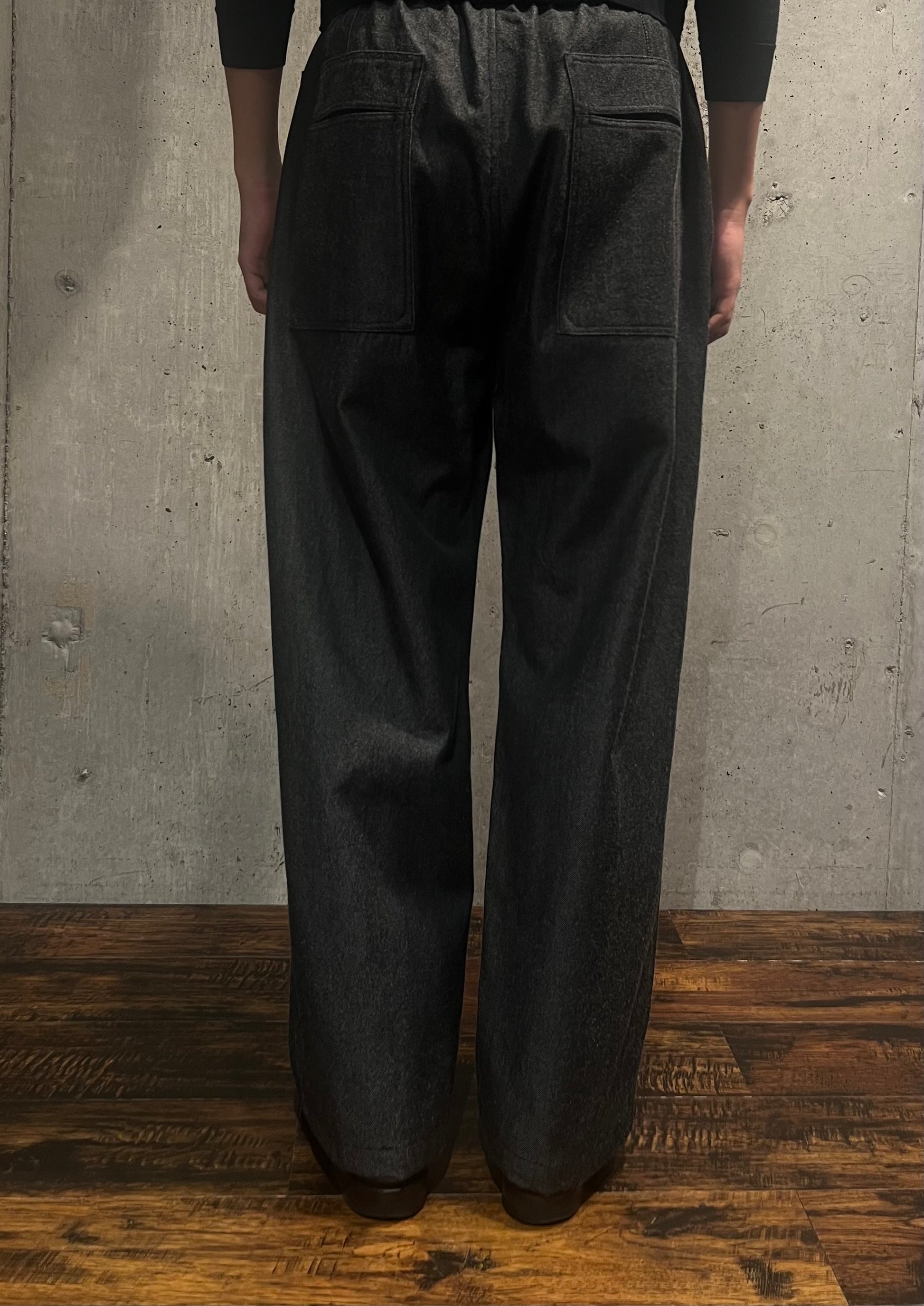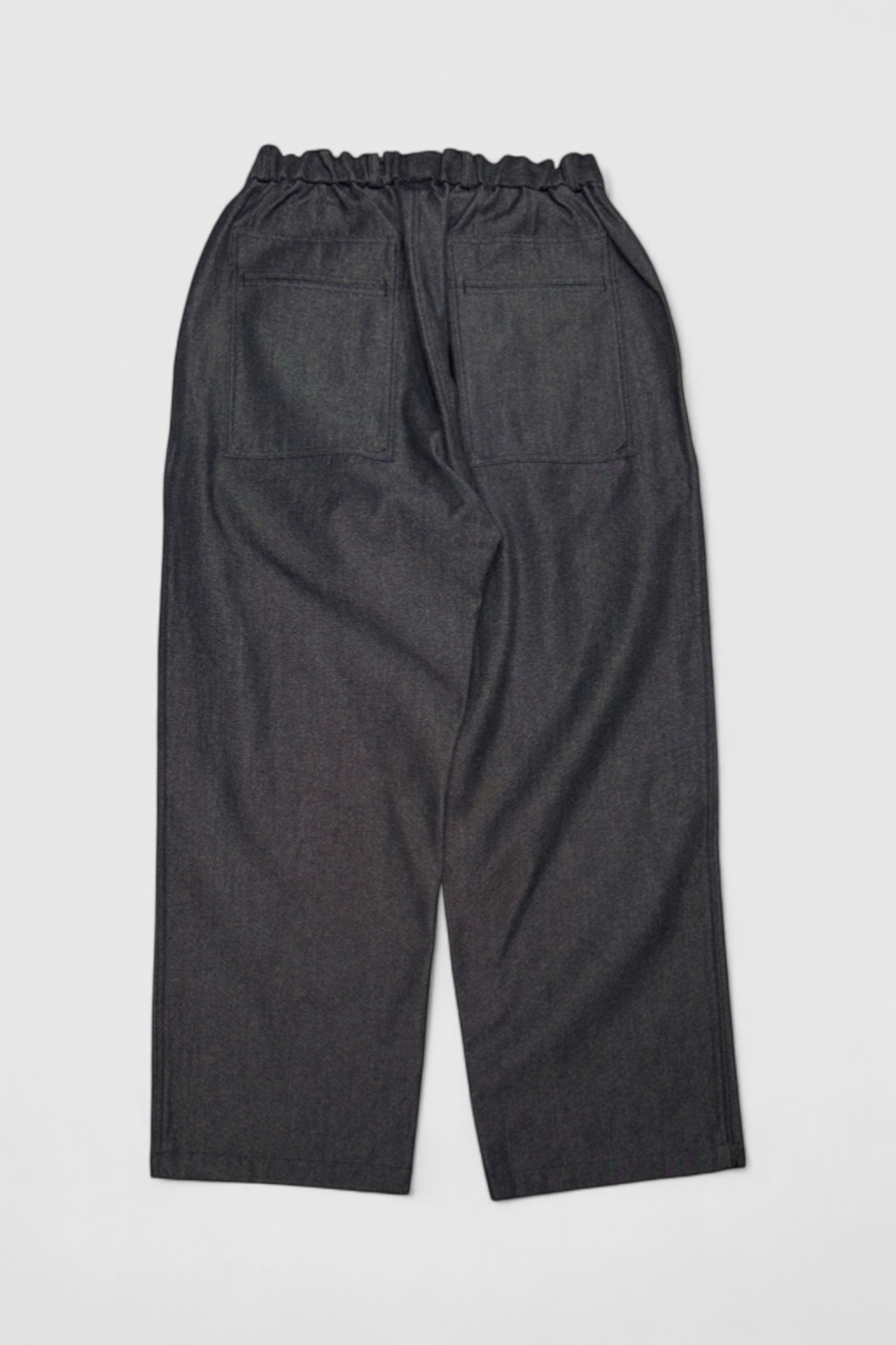 裾幅を広くとったワイドストレートシルエットのパンツです。バックポケットは上下二層構造で、上部パーツをフラップ状に設けることで大きな物も確実に収納し、収納物の落下を防ぎます。生地の高い耐久性を活かしつつ機能性を強化し、日常の道具としての役割を果たします。