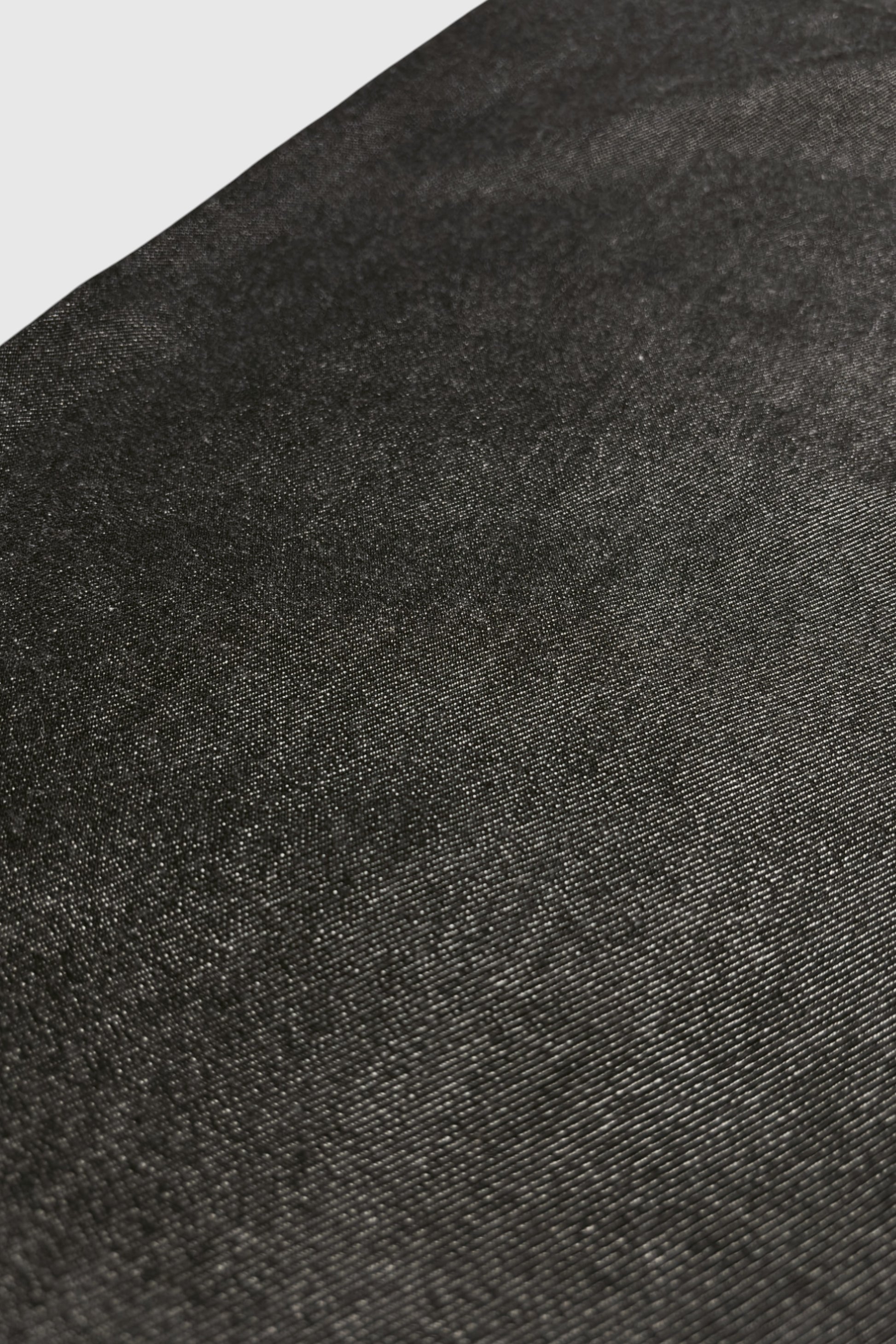 経糸にはノンミュールジングウール、緯糸にはオーガニックコットンを先染め糸で使用され、高密度で織り上げたオリジナルの綾織生地です。ウールにはしっかりと撚糸をかけ、コットンと組み合わせることで、強度を担保しながらも通年使用に適した素材となっています。経糸は全て黒で統一し、緯糸の色違いで白黒や紺黒を展開しています。色差によりシャンブレーのような微細な光沢と深みのある表情が特徴です。ミュールジング(羊の臀部の皺に病原虫が付着するのを防ぐため、無麻酔で皮膚や肉の一部を切除する行為)を行わない原料が採用され、羊への負担を軽減しています。