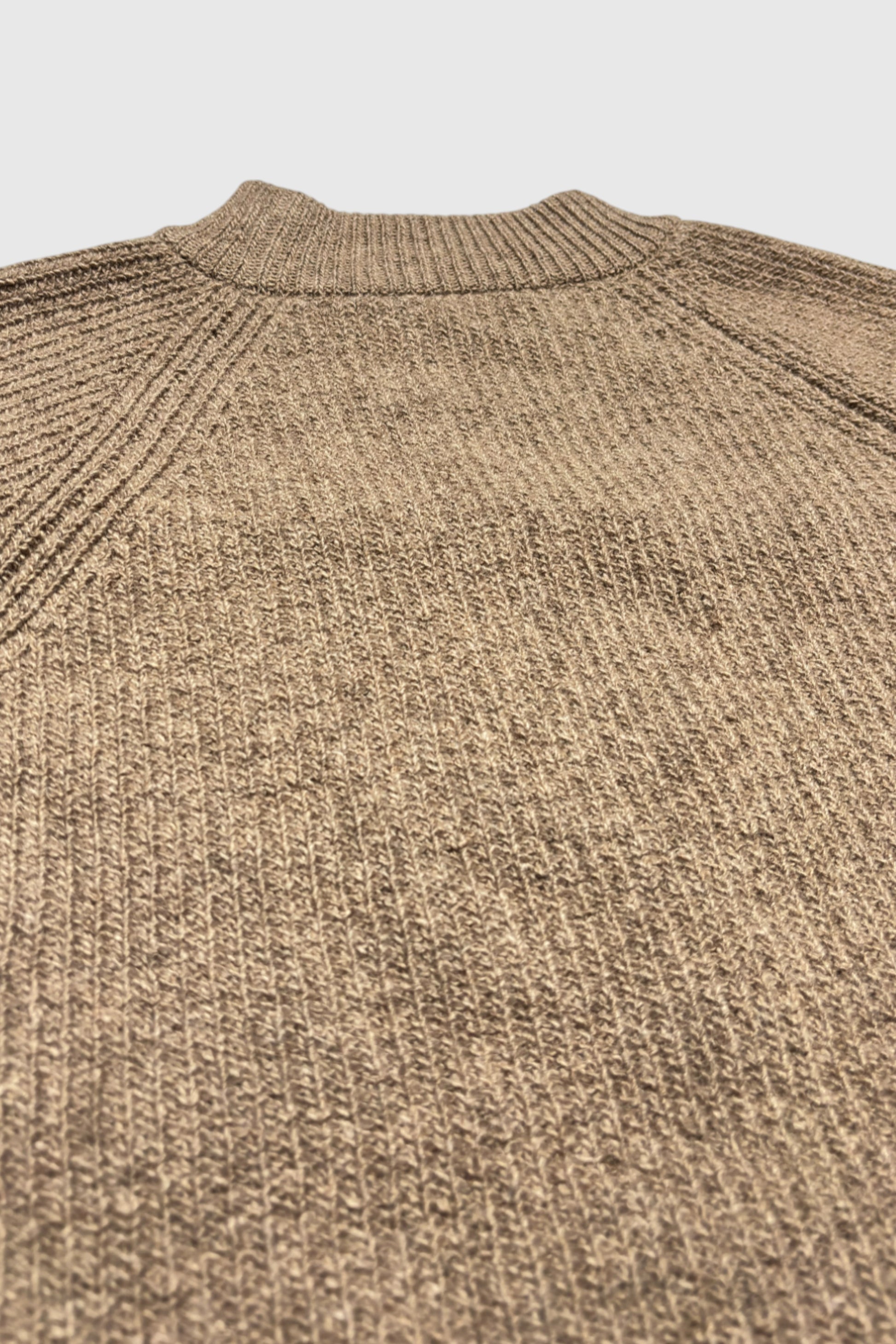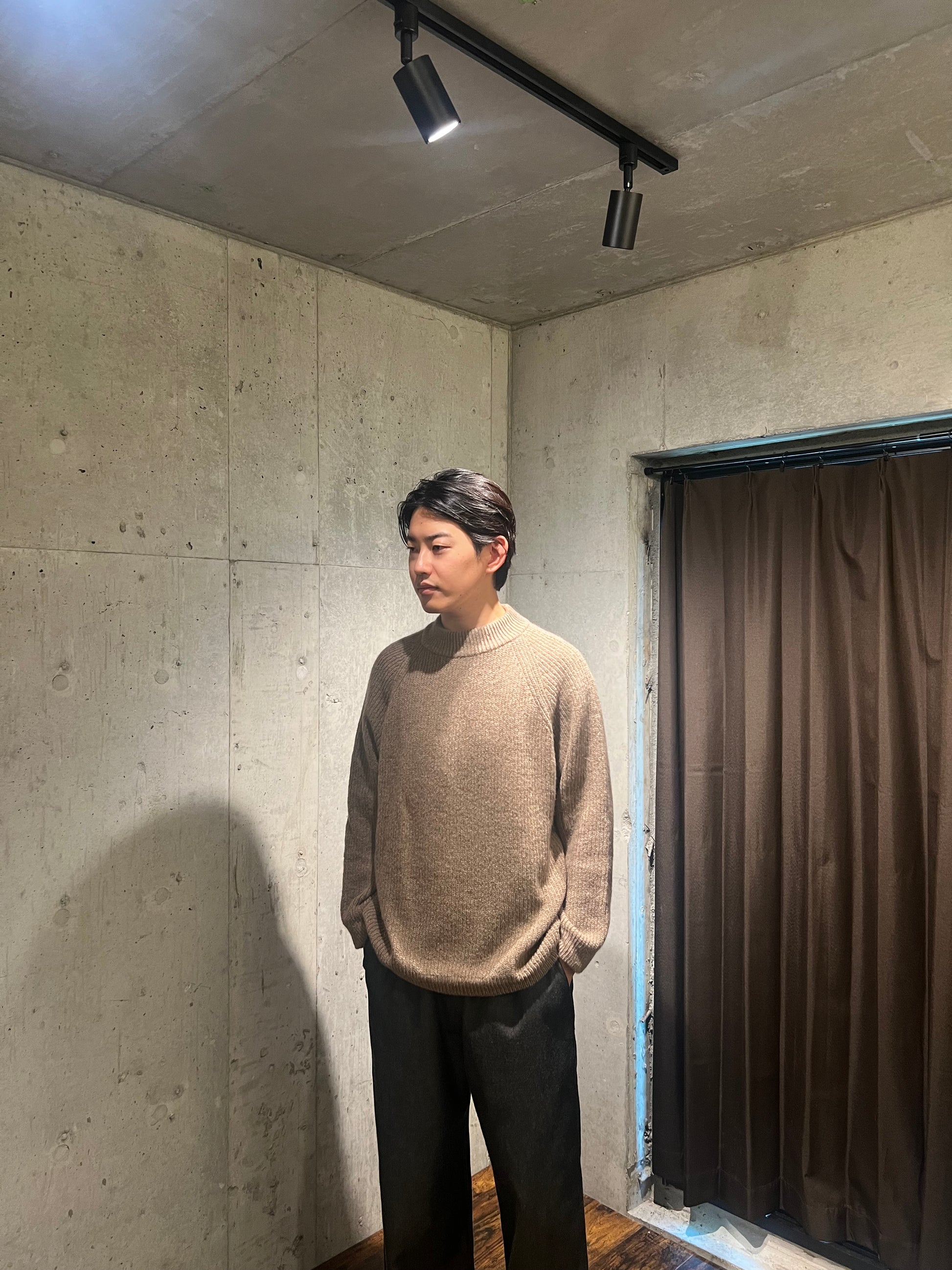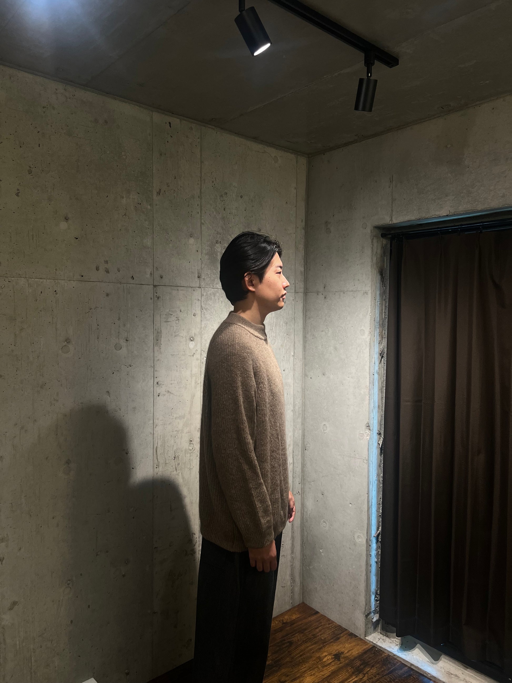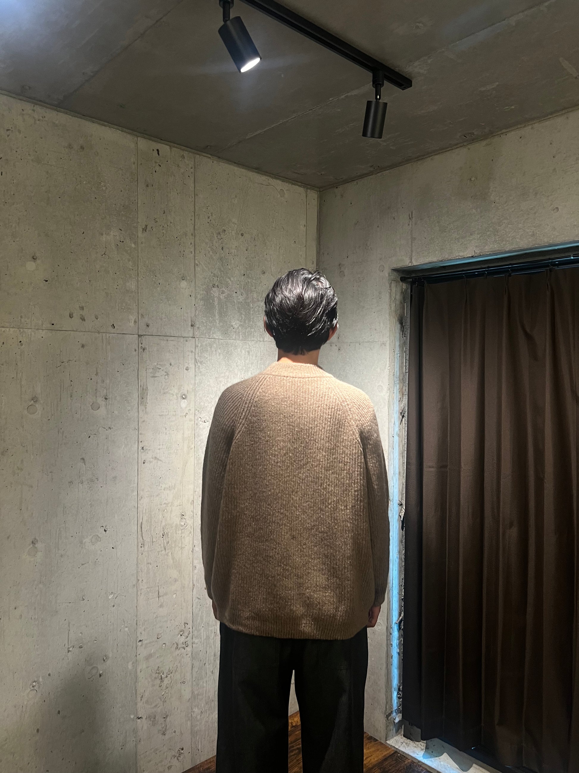 通常はニットでなく絨毯のような織物に使用される糸が使用されています。あえて選別をしすぎないことで生まれた粗野な素材の表情と繊維感を残した無染色のカシミヤの糸が使用され、リブ部分を除いて全体を畦編みで仕上げられています。糸には比較的撚り回数が入っているので、全体的に落ち感が表現されています。