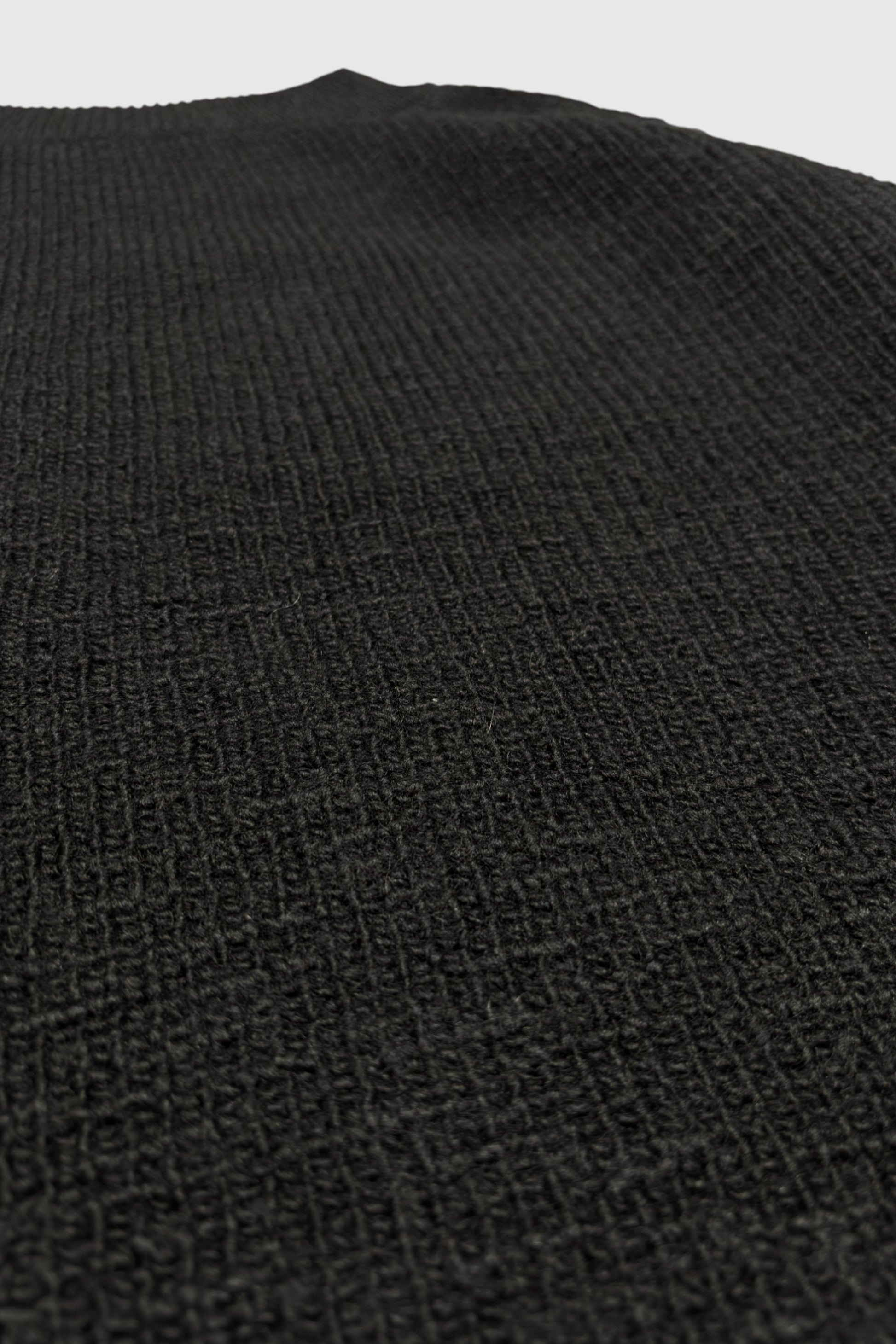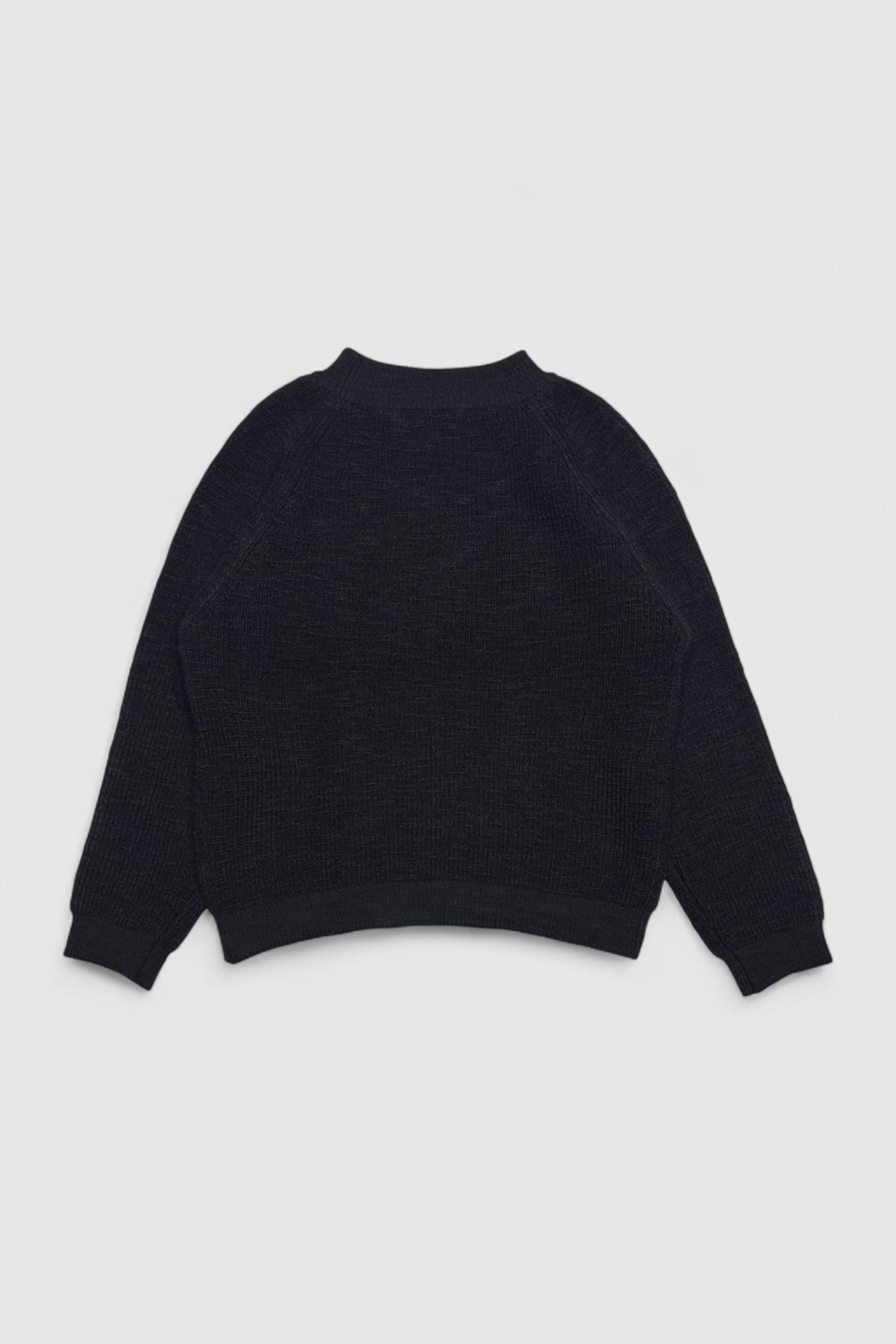 南米ウルグアイ産のノンミュールジングウールを太番手のスラブ糸に紡ぎ、リブ部分を除いて全体を畦編みで仕上げられています。スラブ糸の嵩高性により、ざっくりとした表情ながら軽やかなボリュームを実現しています。ミュールジング(羊の臀部の皺に病原虫が付着するのを防ぐため、無麻酔で皮膚や肉の一部を切除する行為)を行わない原料が採用されており、羊への負担を軽減しています。