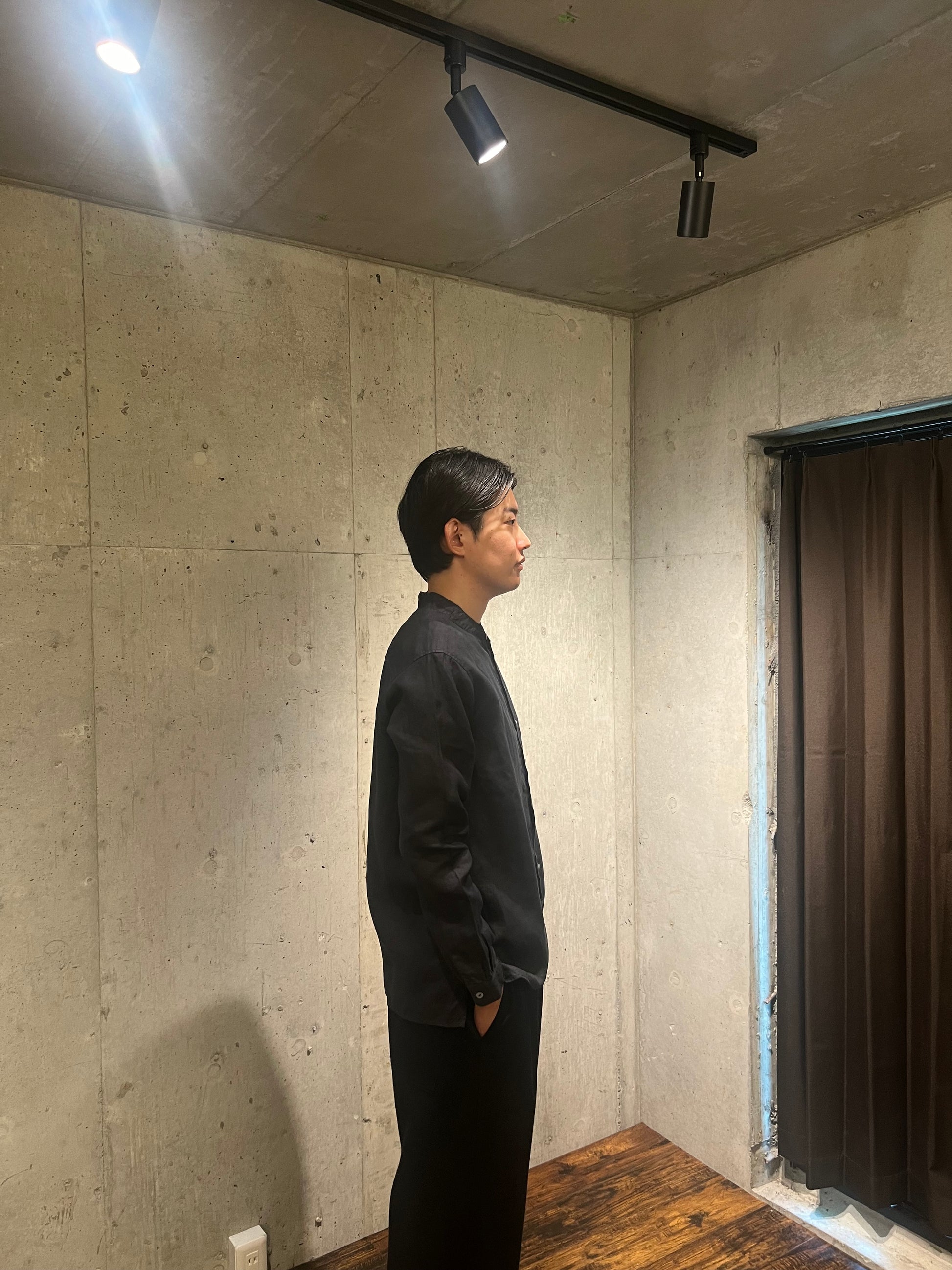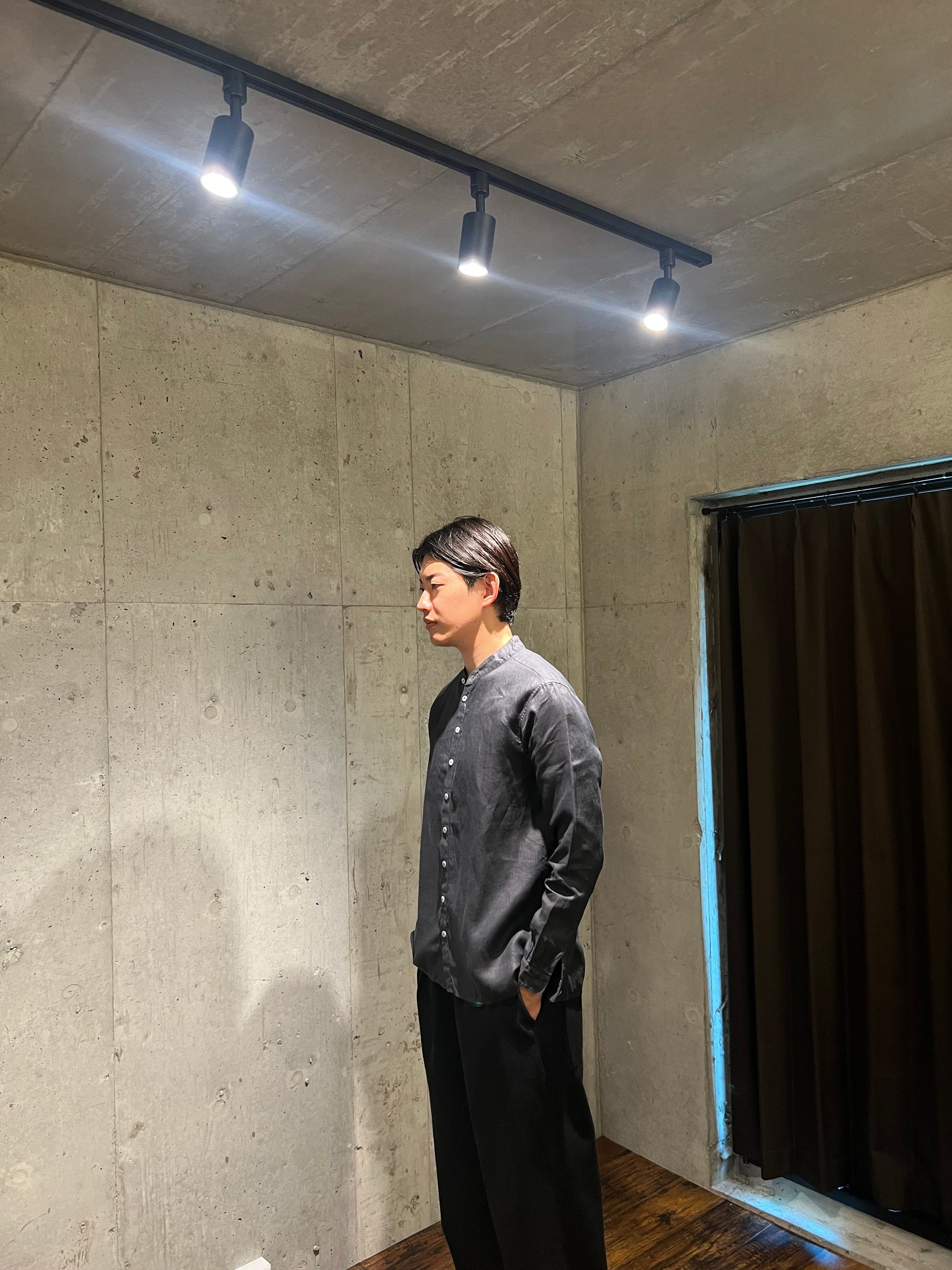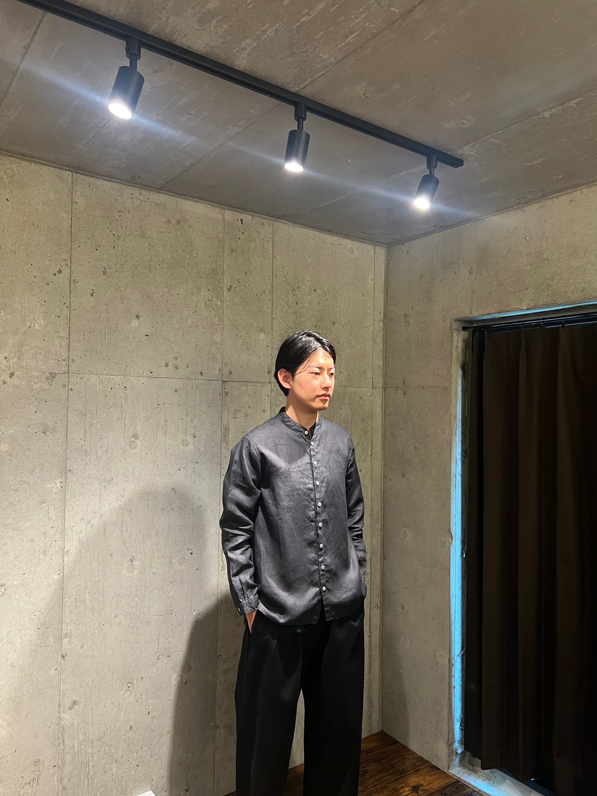 シャツは現代の民族服を構成する洋服としての提案になります。構成は洋服のルールに則りながら、極力デザインを削ぎ落とし、機能性に基づいたパターンメイクとしています。具体的には袖山をいせ込み、袖底を高めに設定することで腕周りの運動量を、背中のヨークにタックやギャザーではなく、いせを入れることで背中の運動量を確保しています。ボタンには薄い白蝶貝を用いてます。