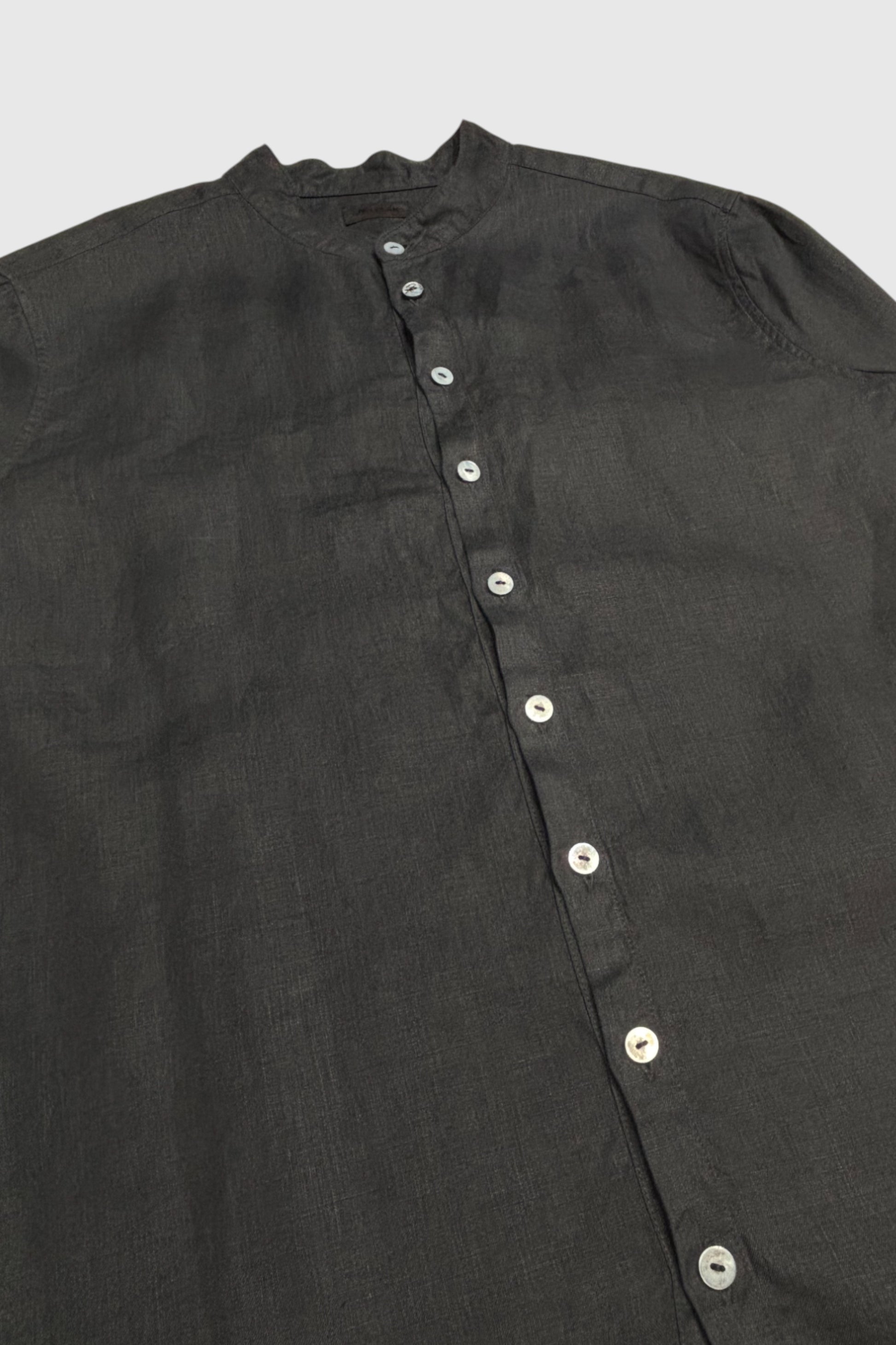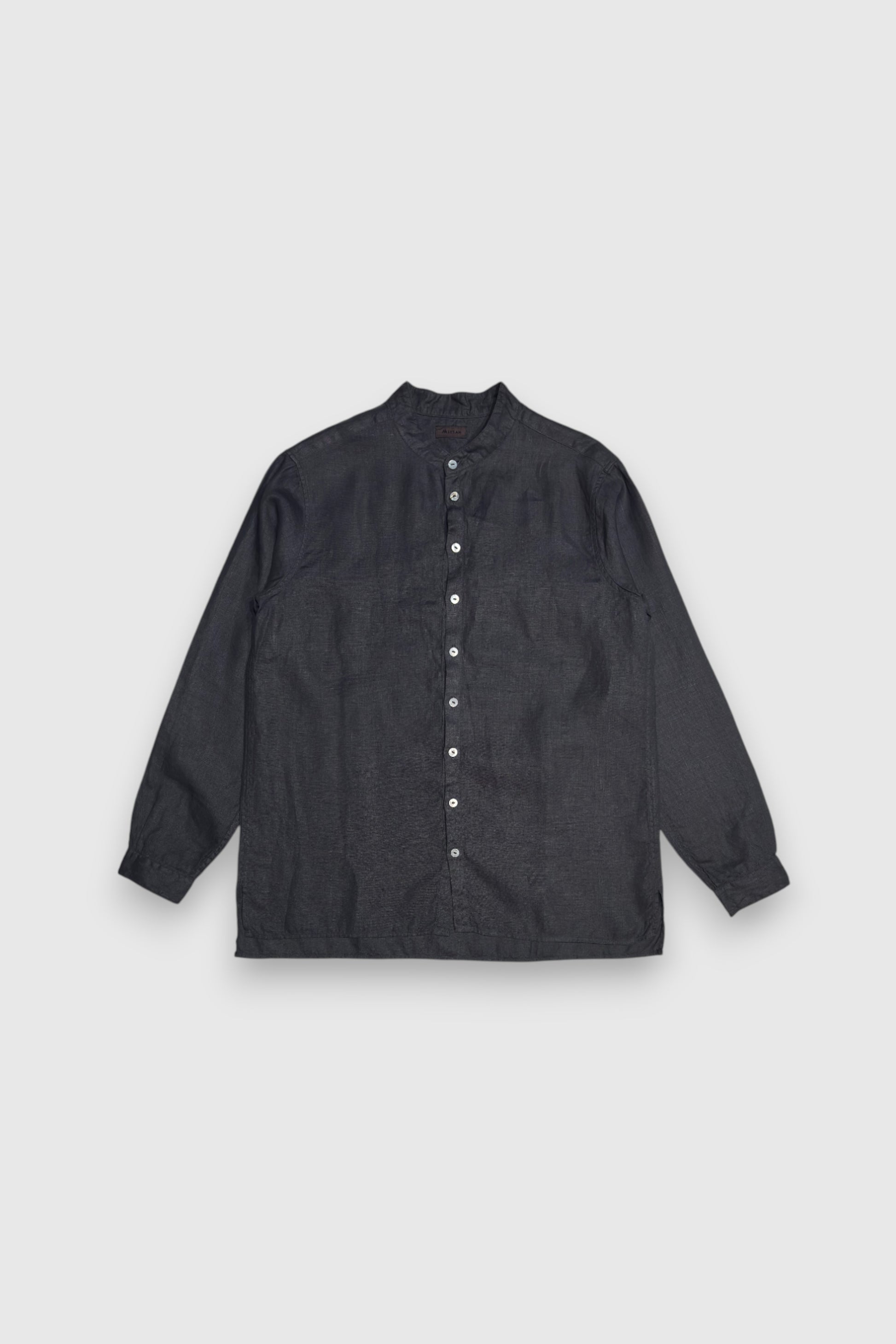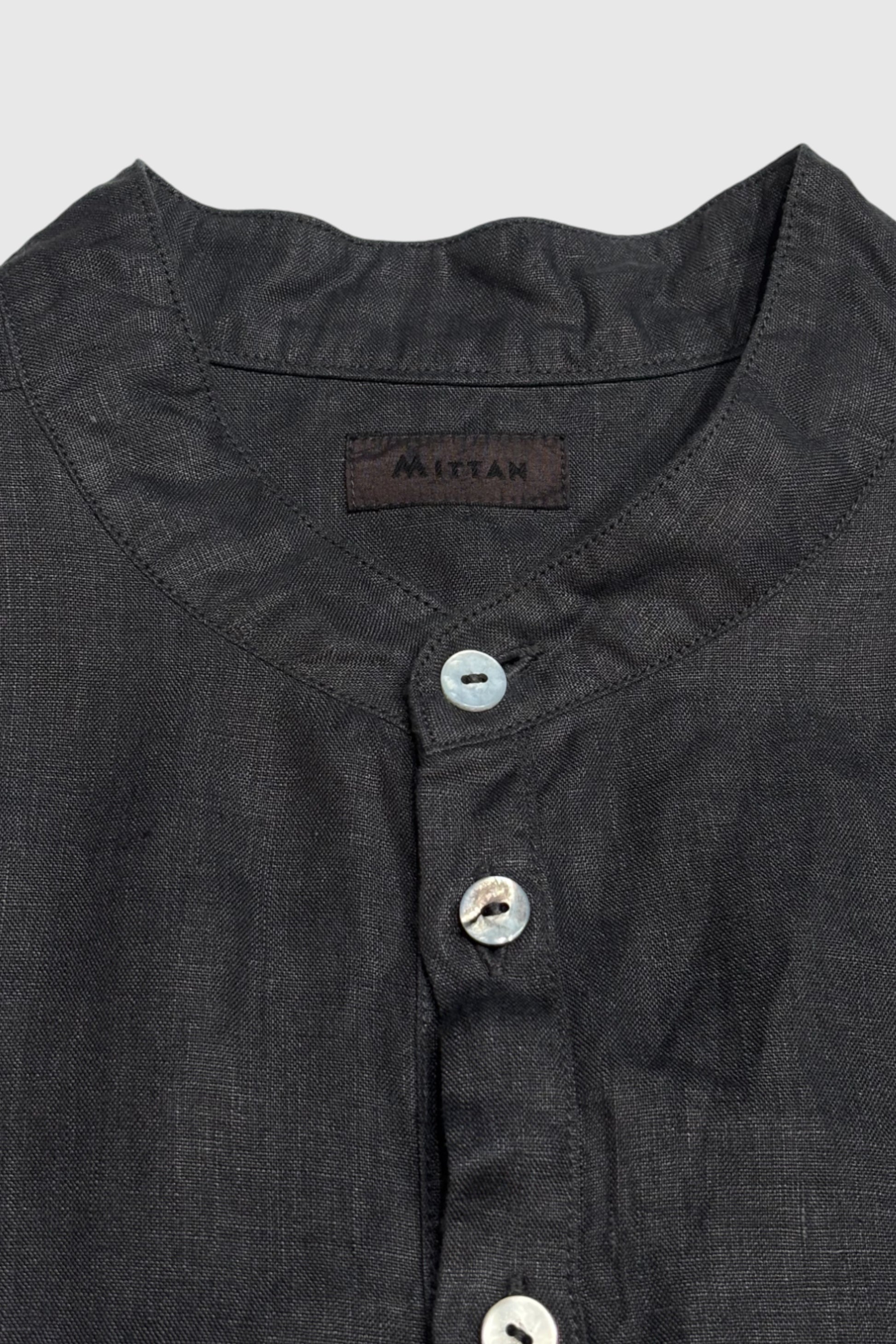 シャツは現代の民族服を構成する洋服としての提案になります。構成は洋服のルールに則りながら、極力デザインを削ぎ落とし、機能性に基づいたパターンメイクとしています。具体的には袖山をいせ込み、袖底を高めに設定することで腕周りの運動量を、背中のヨークにタックやギャザーではなく、いせを入れることで背中の運動量を確保しています。ボタンには薄い白蝶貝を用いてます。