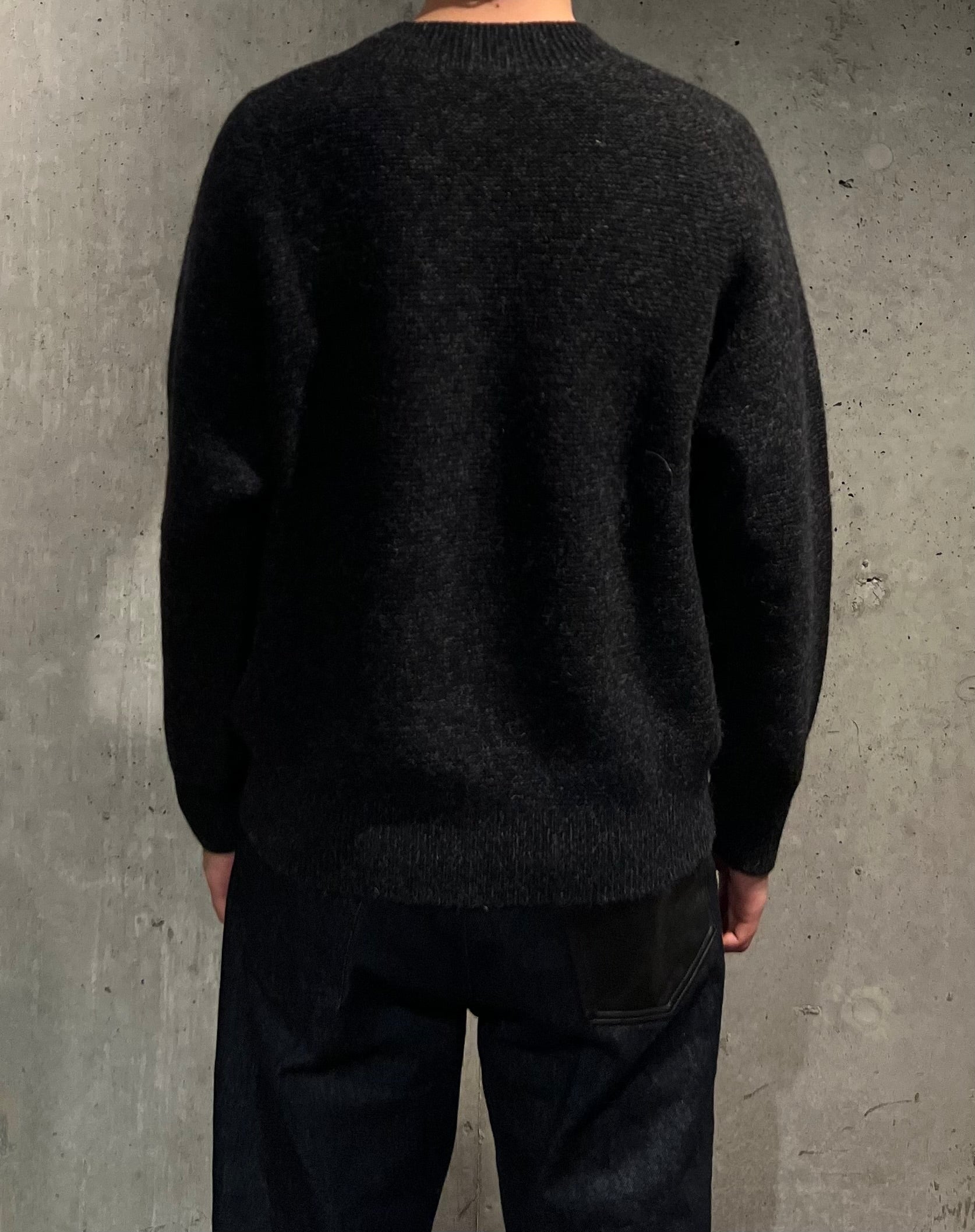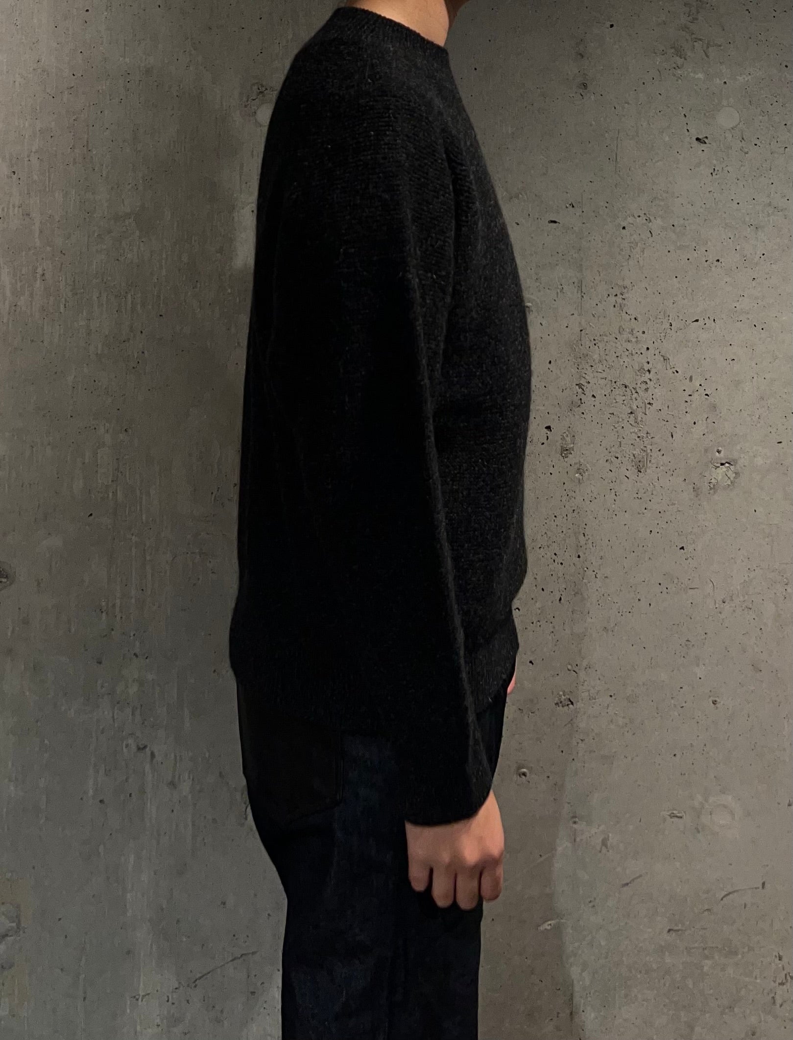身頃と袖を広めに設計することで、動きやすさとゆとりを実現したデザインです。また、しっかりとした質感のガーター編みを本体に使用することで、立体的なボリューム感が生まれるシルエットになっています。長過ぎない丈で、すっきりと着用することが可能です。