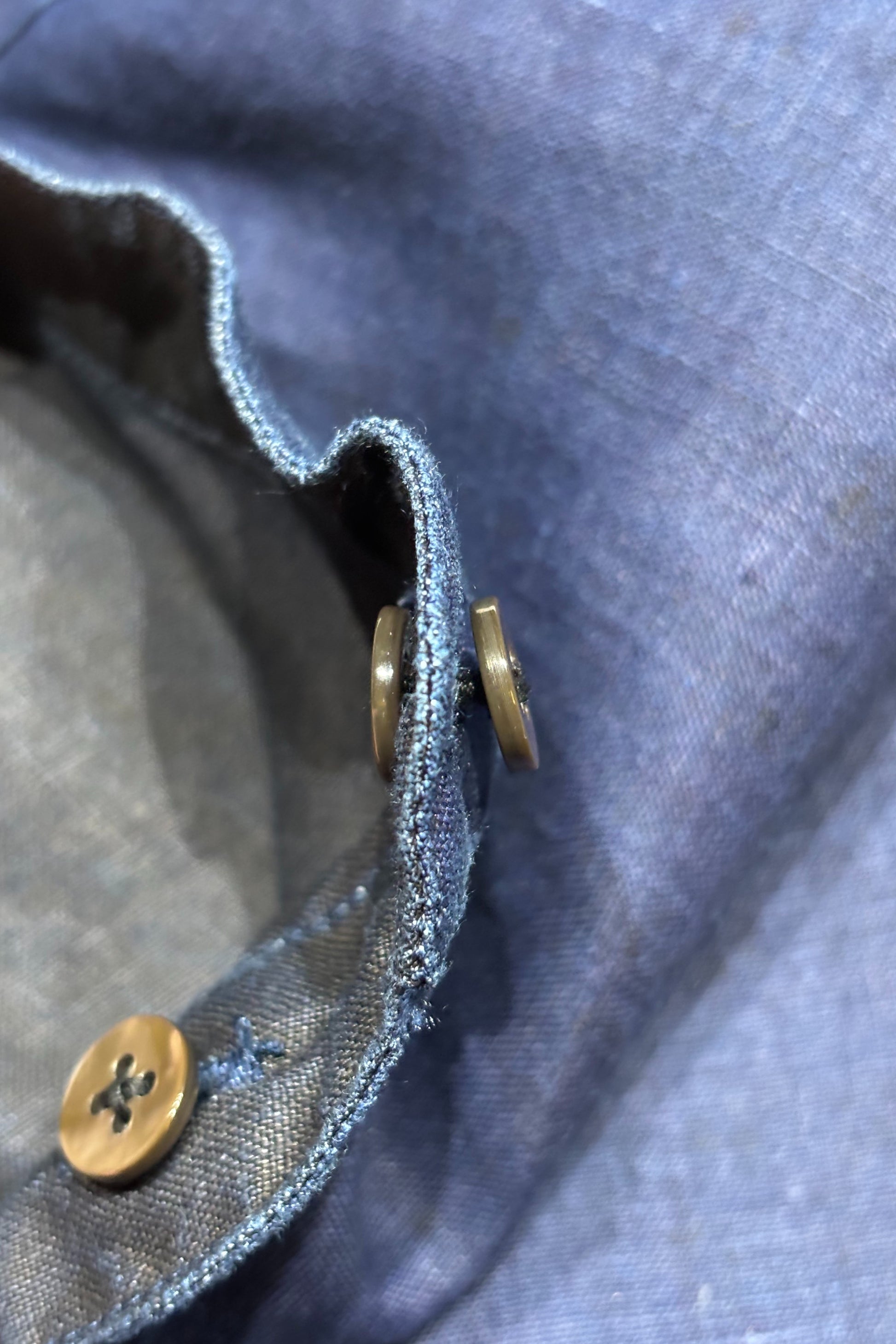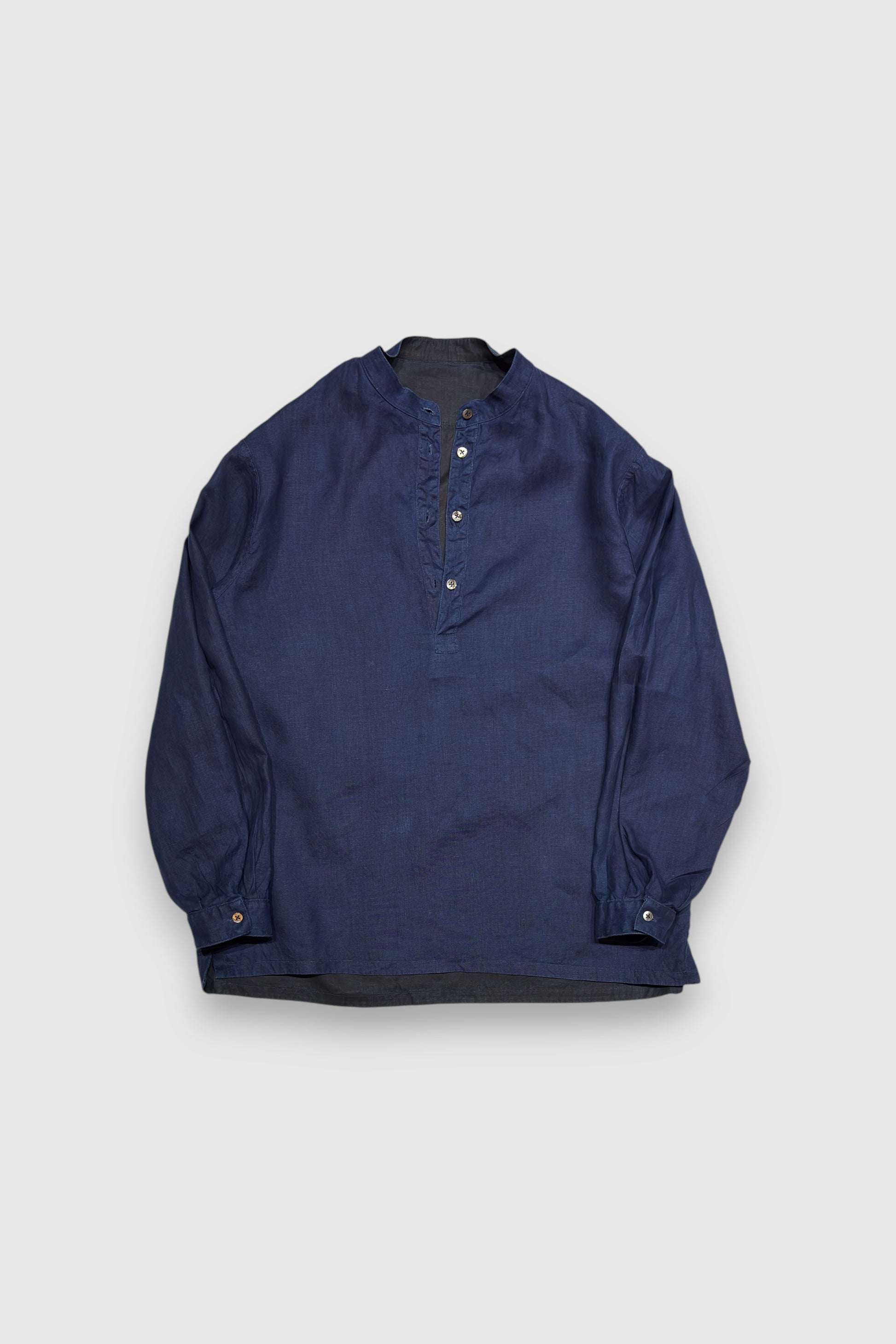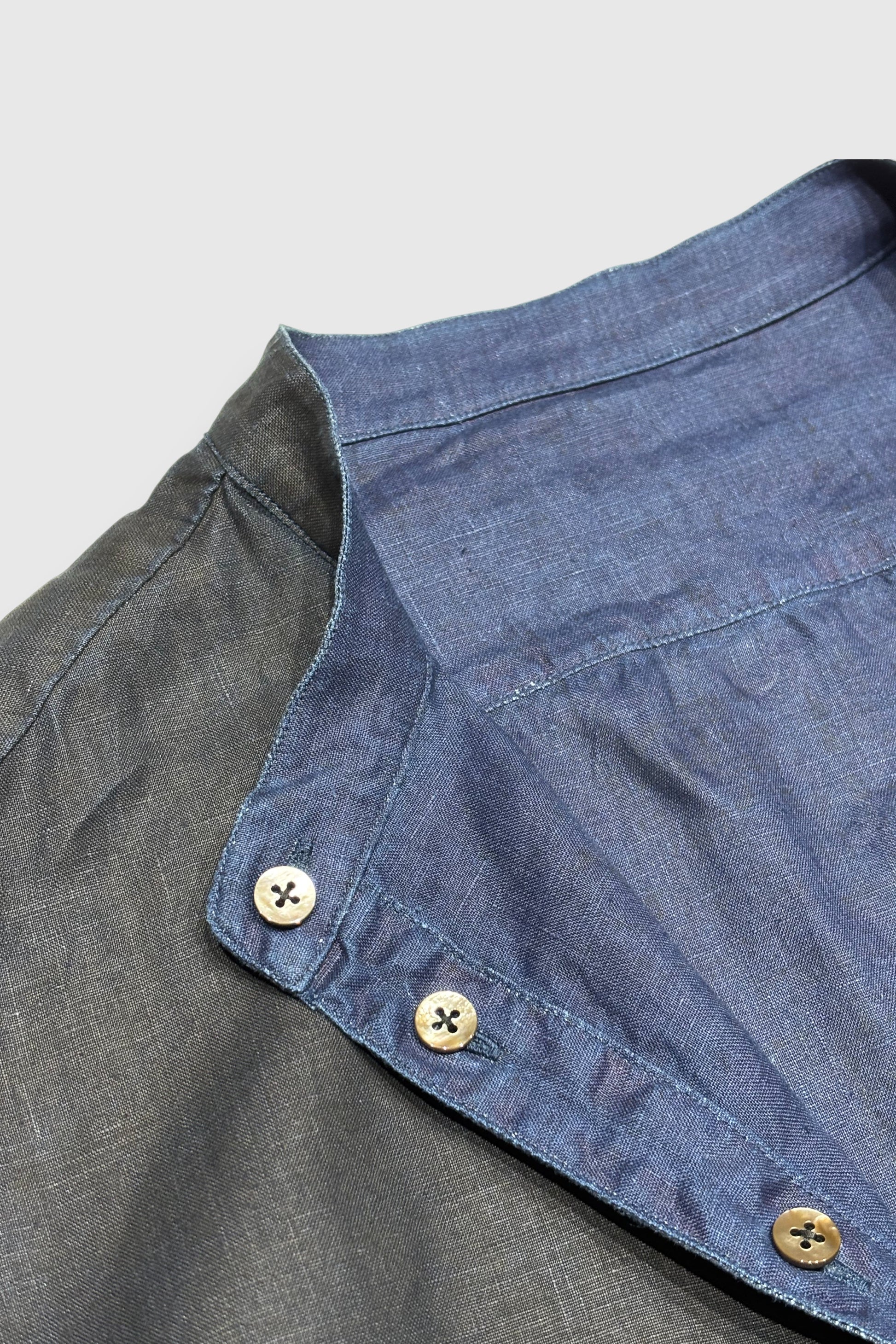 ラフに着ることのできる緩めのフィットのシャツです。表裏で異なる色という生地の特性を生かした、リバーシブルで着用できる仕様です。裏面のインディゴの色を表にした際にも、表側の墨の色が極力見えないよう、各パーツの配置や縫製が工夫されています。ボタンには、リバーシブル仕様を可能にする太鼓釦が採用されています。職人の手作業を必要とする太鼓釦は近年需要が減り、製作できる職人も限られており、大変希少です。