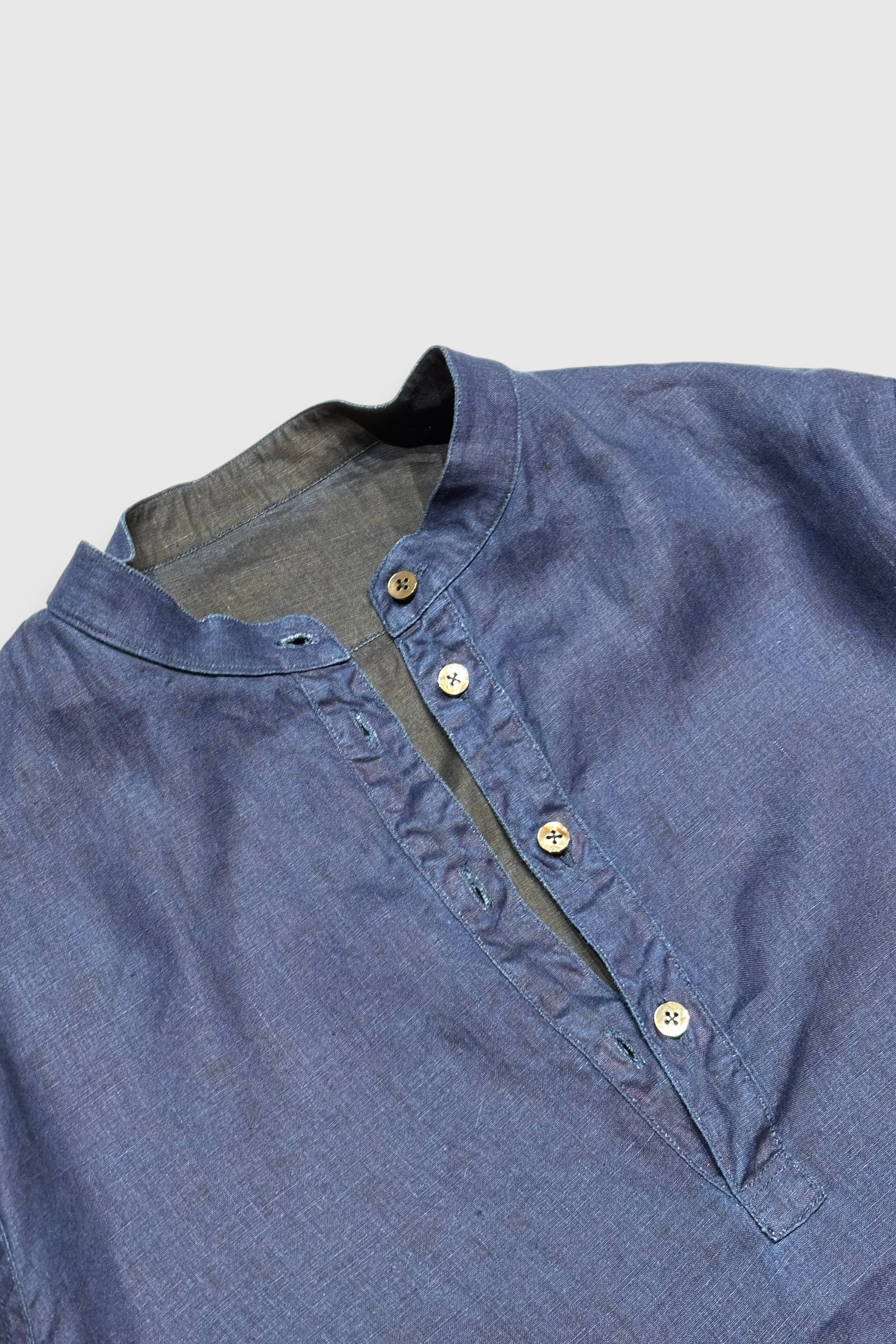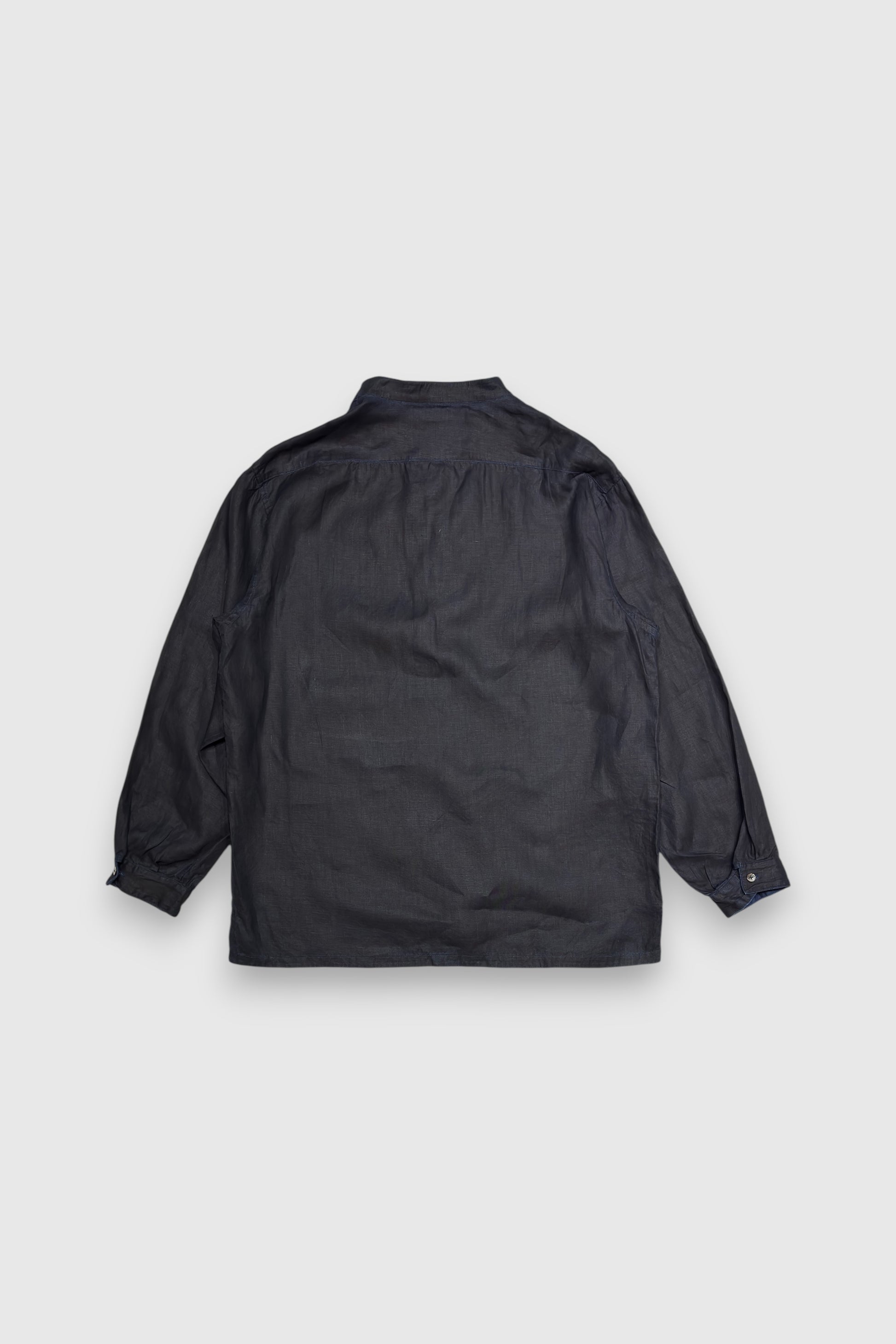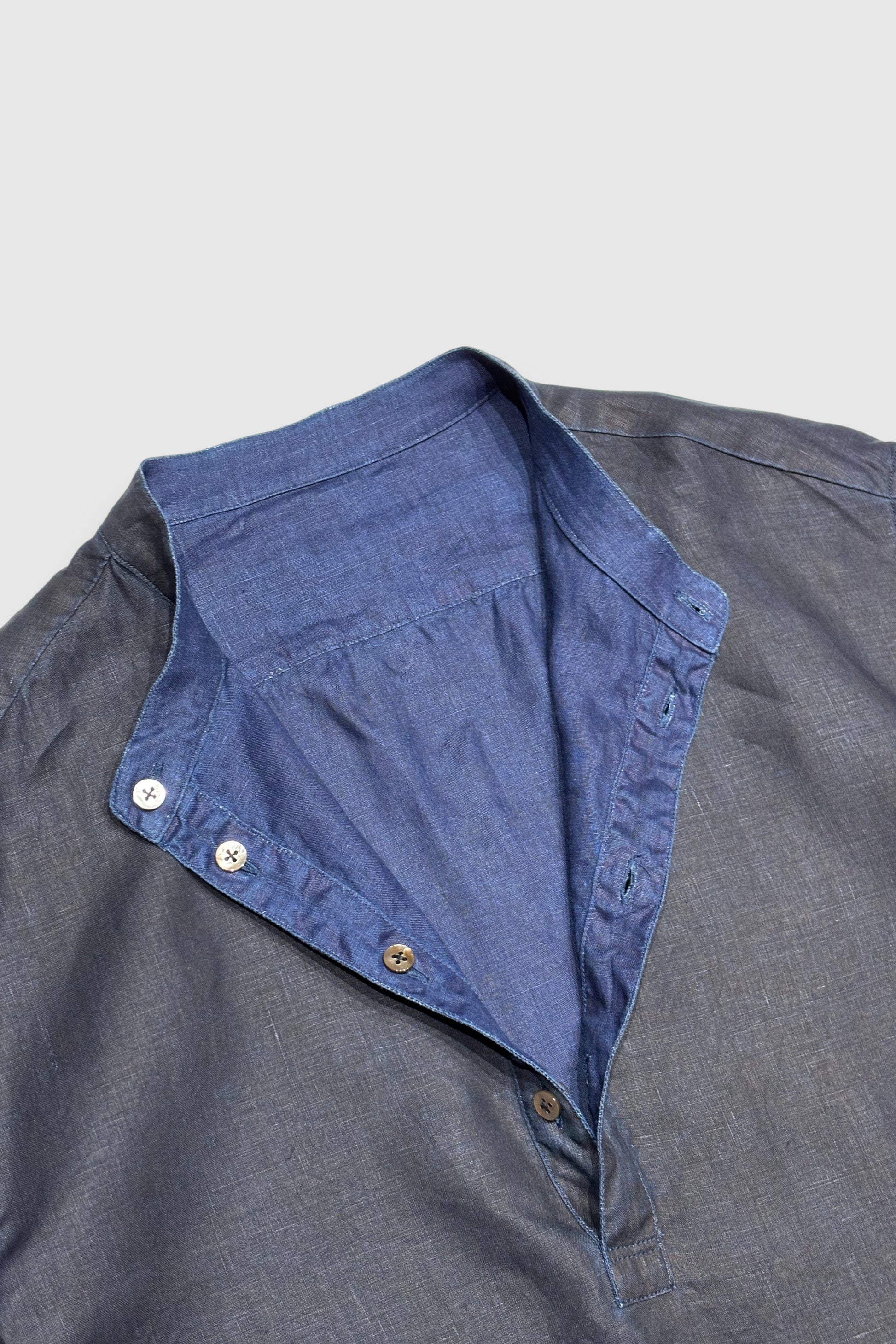 ラフに着ることのできる緩めのフィットのシャツです。表裏で異なる色という生地の特性を生かした、リバーシブルで着用できる仕様です。裏面のインディゴの色を表にした際にも、表側の墨の色が極力見えないよう、各パーツの配置や縫製が工夫されています。ボタンには、リバーシブル仕様を可能にする太鼓釦が採用されています。職人の手作業を必要とする太鼓釦は近年需要が減り、製作できる職人も限られており、大変希少です。