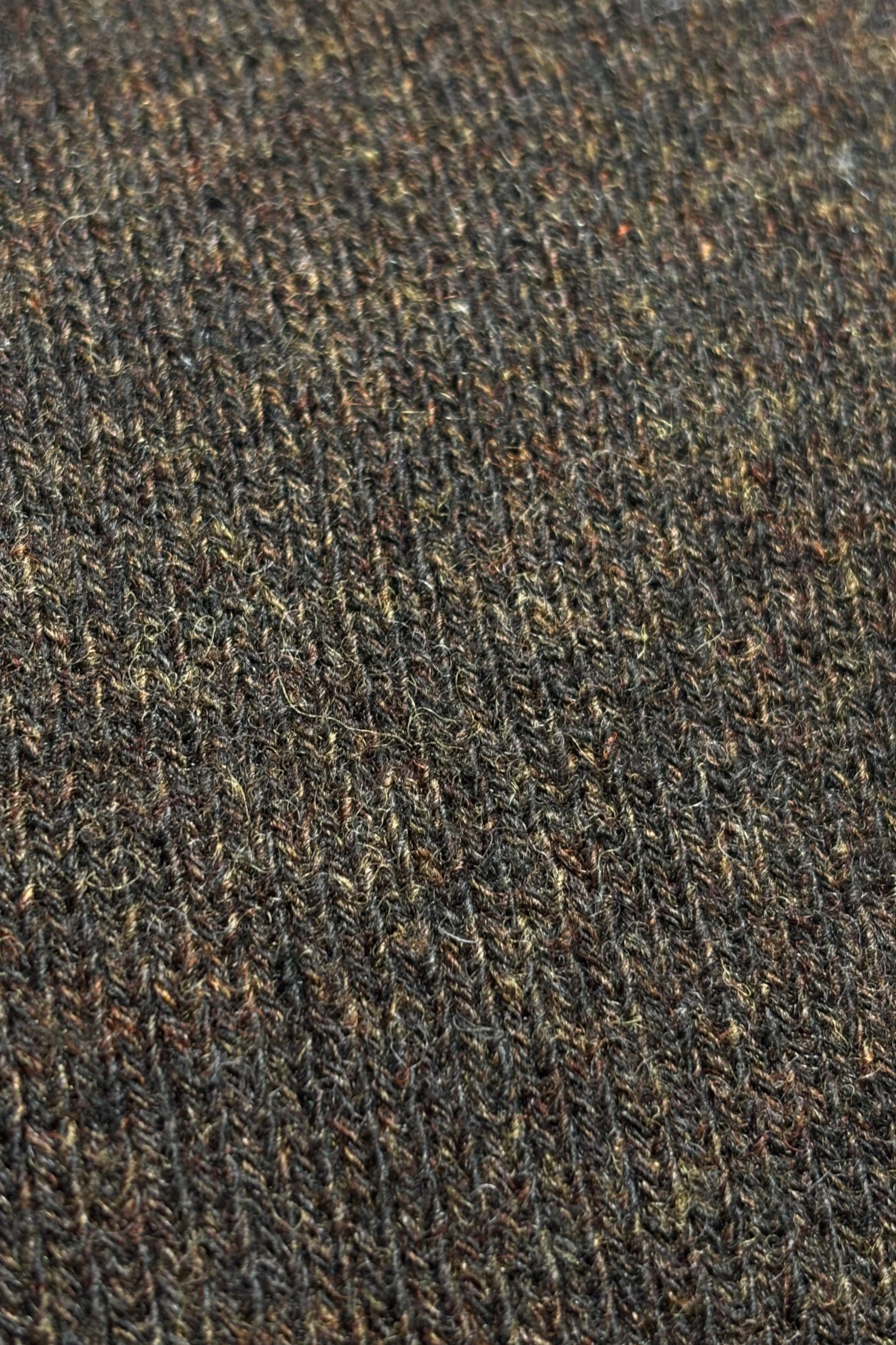 ゴリっとしたタッチ、ミリタリーセーターのような素材感をイメージして制作されていますが、硬さや張り感は生かしながらも、動きやすく、身体に馴染むようにゴム編み組織で仕上げられています。糸が丈夫な上、目を詰めたゴム地で編まれているためキックバックもよく、家庭洗濯をしても型崩れしにくいです。