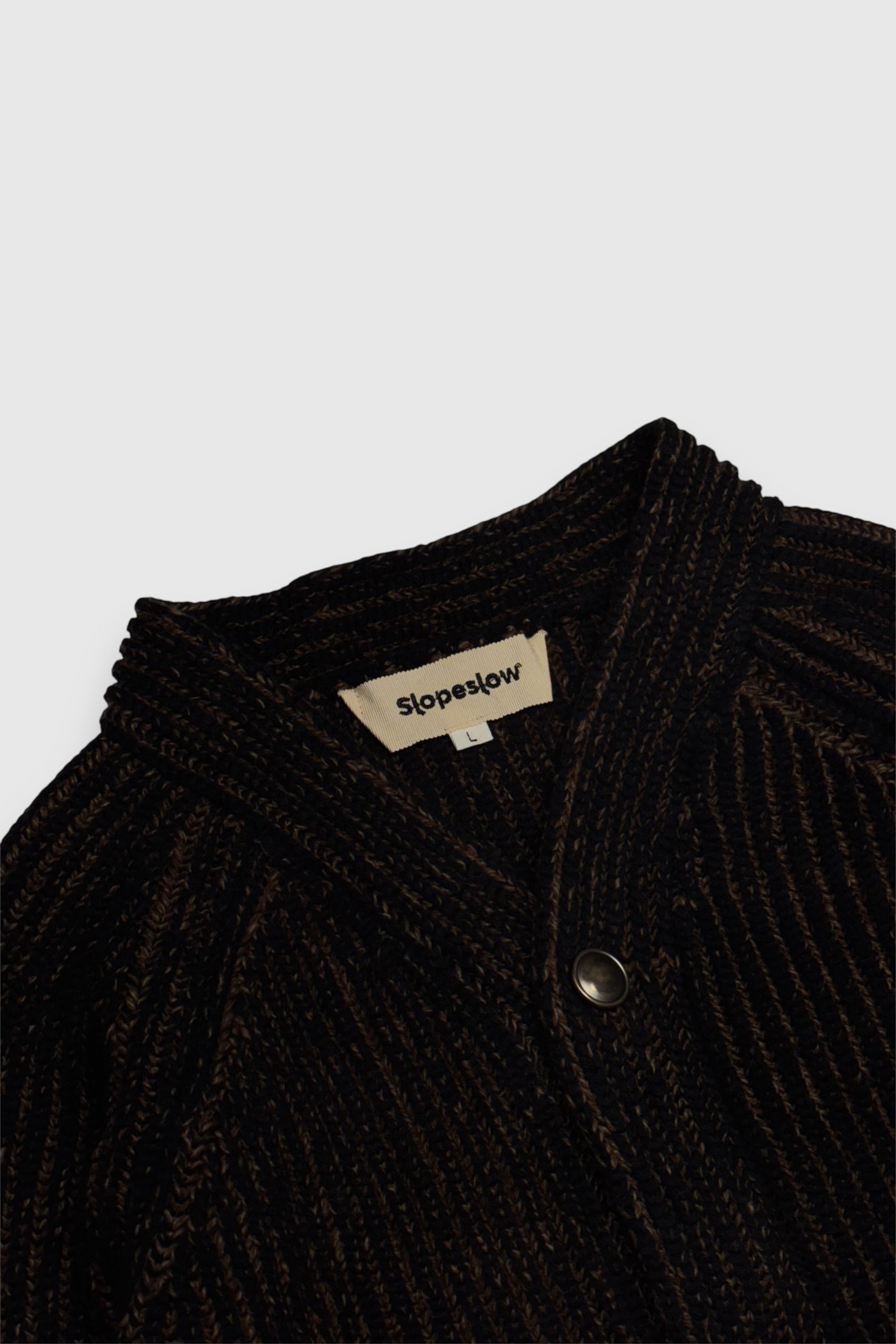 Slopeslowの定番モデルとなっているカウチンセーターと同じ原料(ヤクとラムウールの掛け合わせの糸)が使われ、カウチンセーターの半分の本数取りで仕立てられた機械編みのカーディガンです。