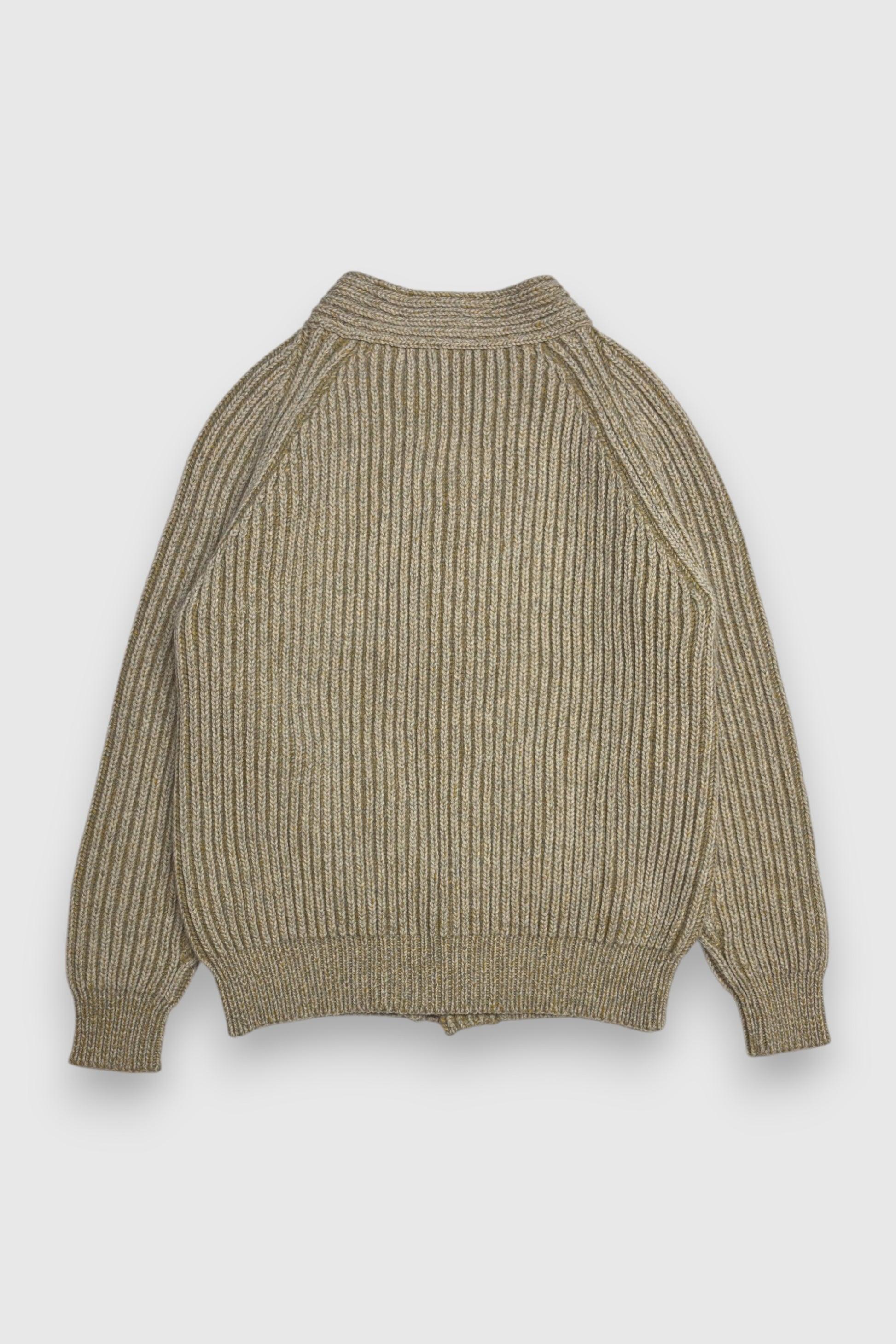 Slopeslowの定番モデルとなっているカウチンセーターと同じ原料(ヤクとラムウールの掛け合わせの糸)が使われ、カウチンセーターの半分の本数取りで仕立てられた機械編みのカーディガンです。