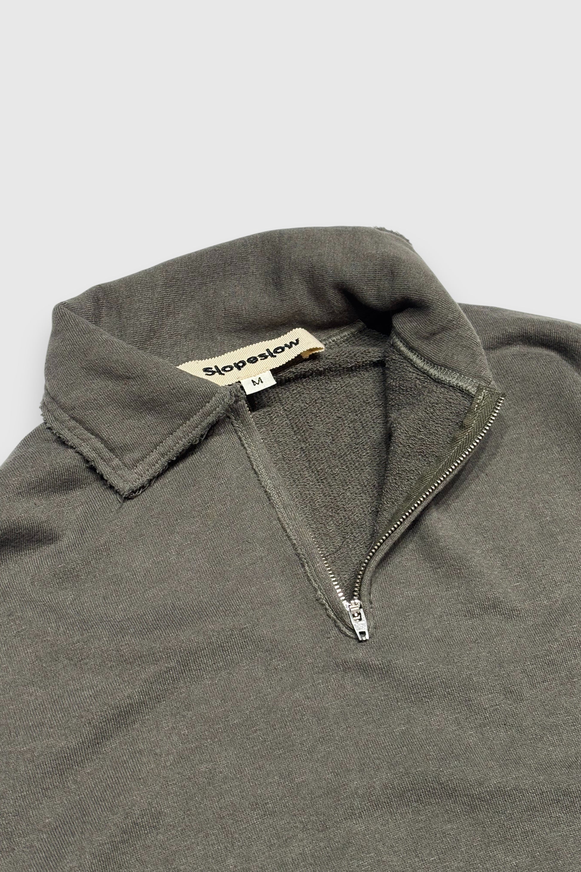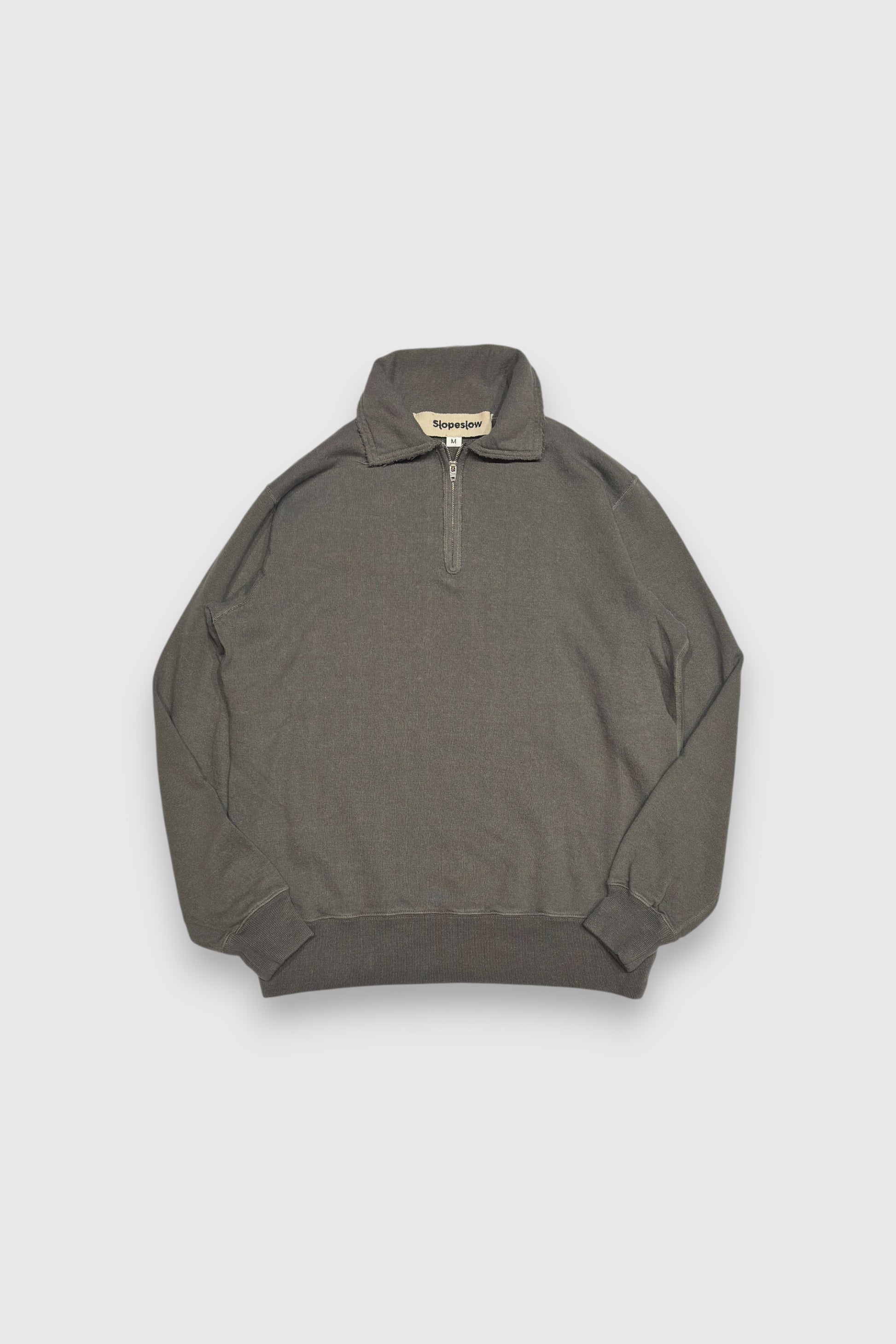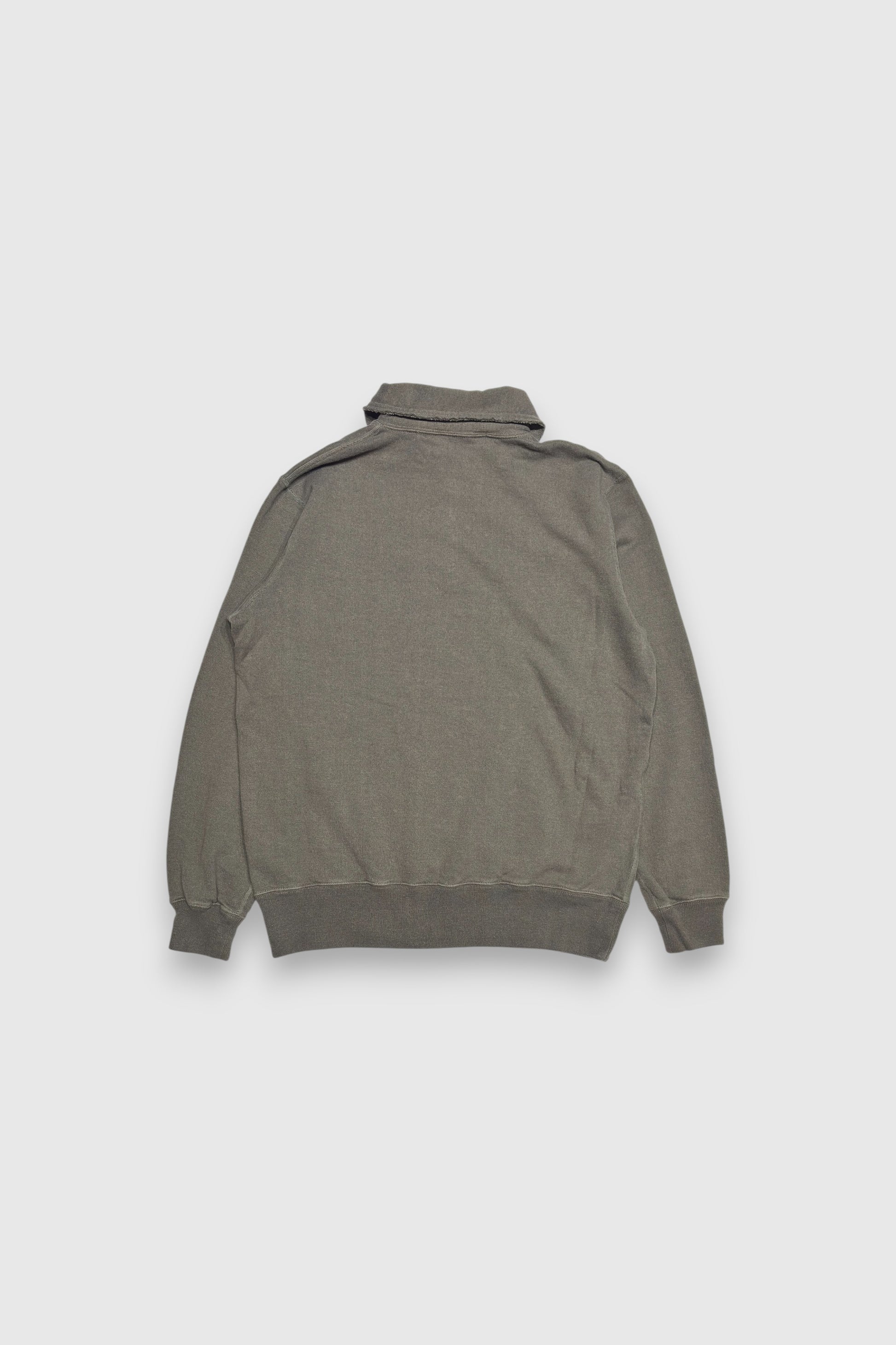 25SSからの継続した素材・モデルのアイテムです。色はエクリュをベースに、オーバーダイ、製品染めで仕上げられています。表糸と裏のループ糸にはフランス・リール地方で栽培されたリネンと、オーガニックコットンを混紡した糸、中糸はコットンの糸を使用したオリジナル素材が採用されています。薄手に仕上がるようにループを3飛びにし、度目を甘く吊り編み機で編んだ裏毛となっています。