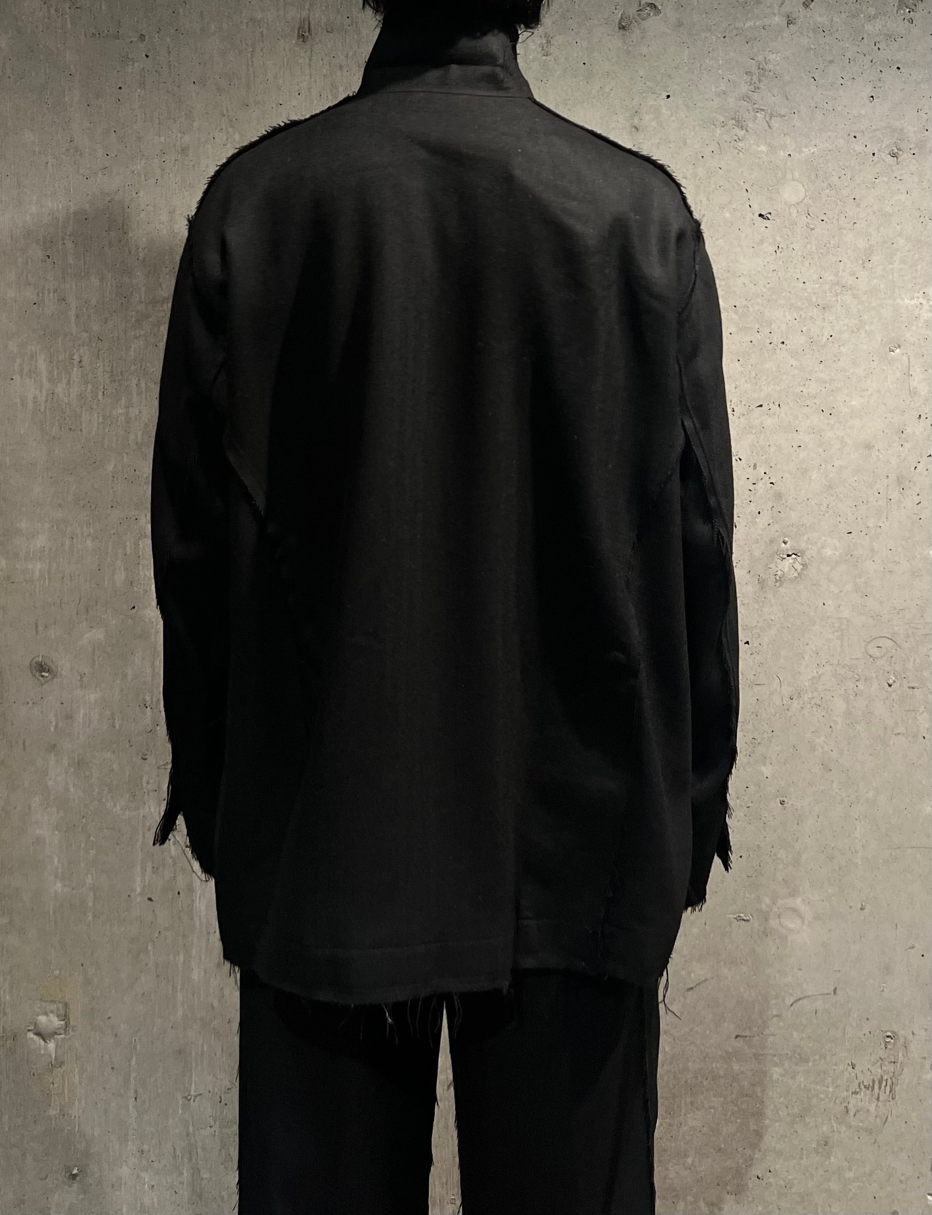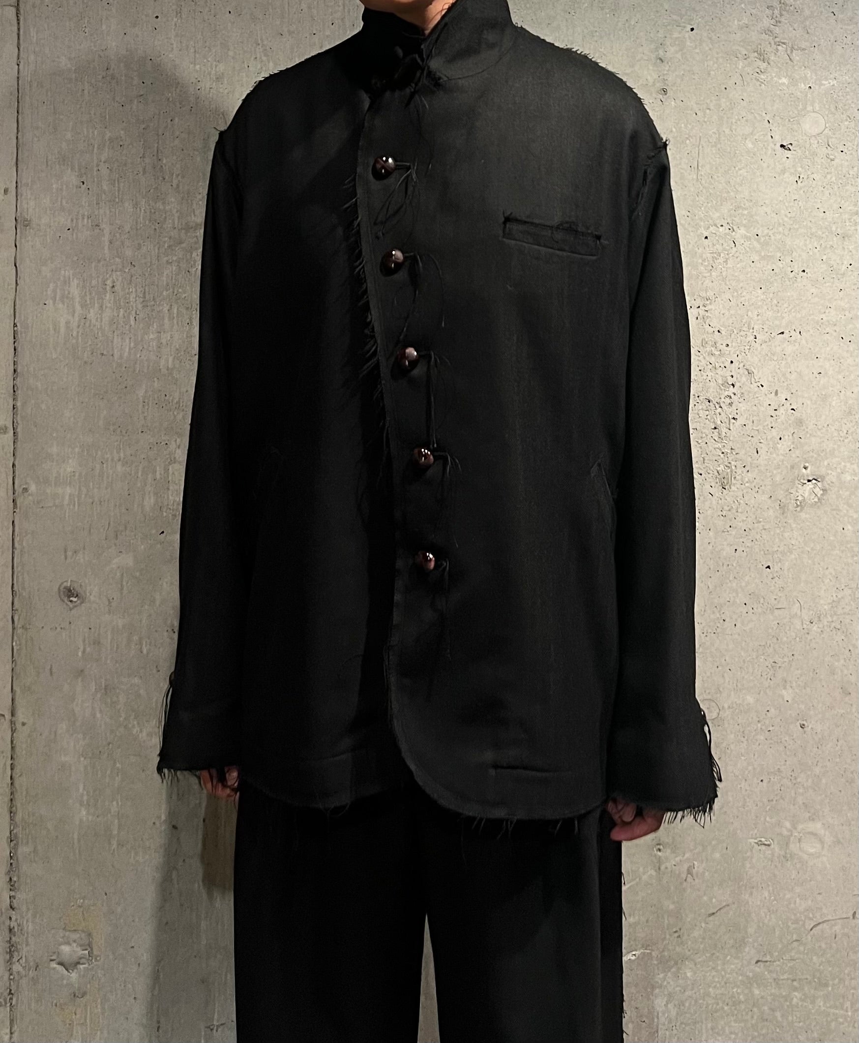 デザイナーが記憶を頼りにパターンを起こしたUrigオリジナル型のジャケットです。全体的に断ち切りの加工を施すことで、品のある雰囲気と粗野な雰囲気とが両立した逸品となっております。アクセントには異素材レザー合わせのクルミボタンを採用されています。たっぷりと用尺を取った長めの着丈で、ハーフコートとして着用も可能です。