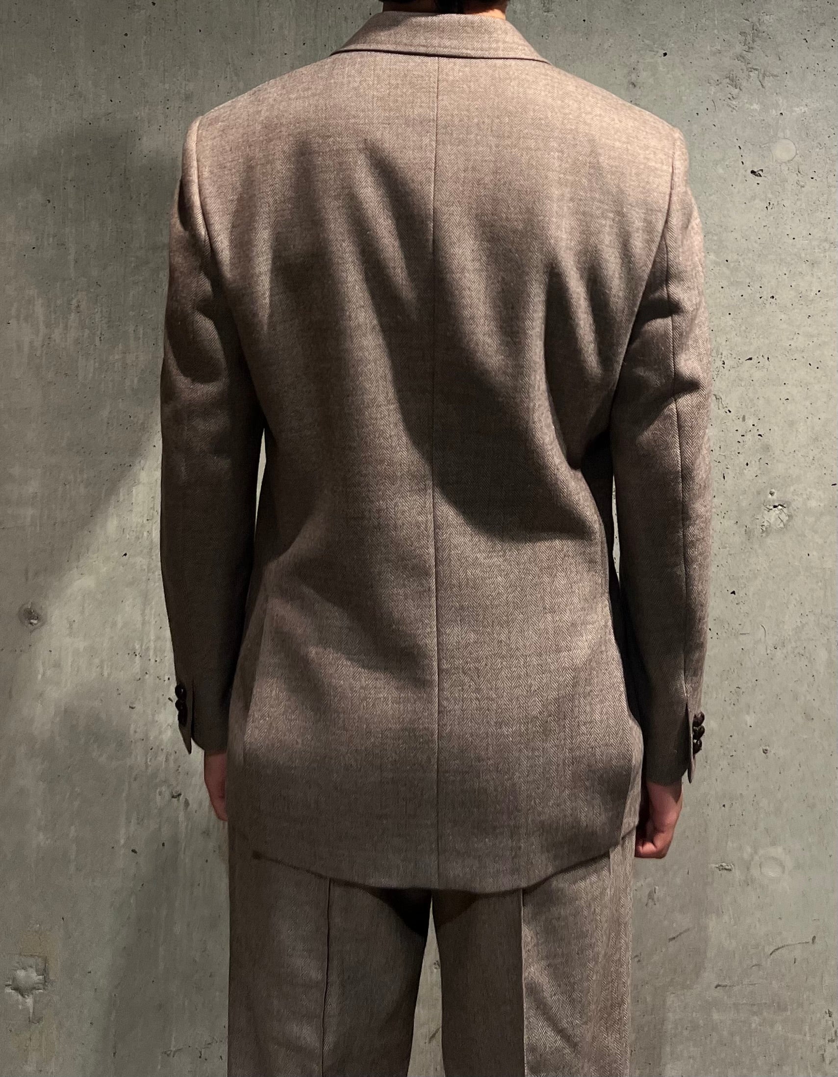 アルパカ混のサキソニー生地が採用されたダブルブレストジャケットです。ウールの中でも最高級のメリノウールを使用し、縮絨加工後に起毛処理をすることで艶やかで程よいハリがありながらも着心地の良い柔らかな仕上がりになっています。