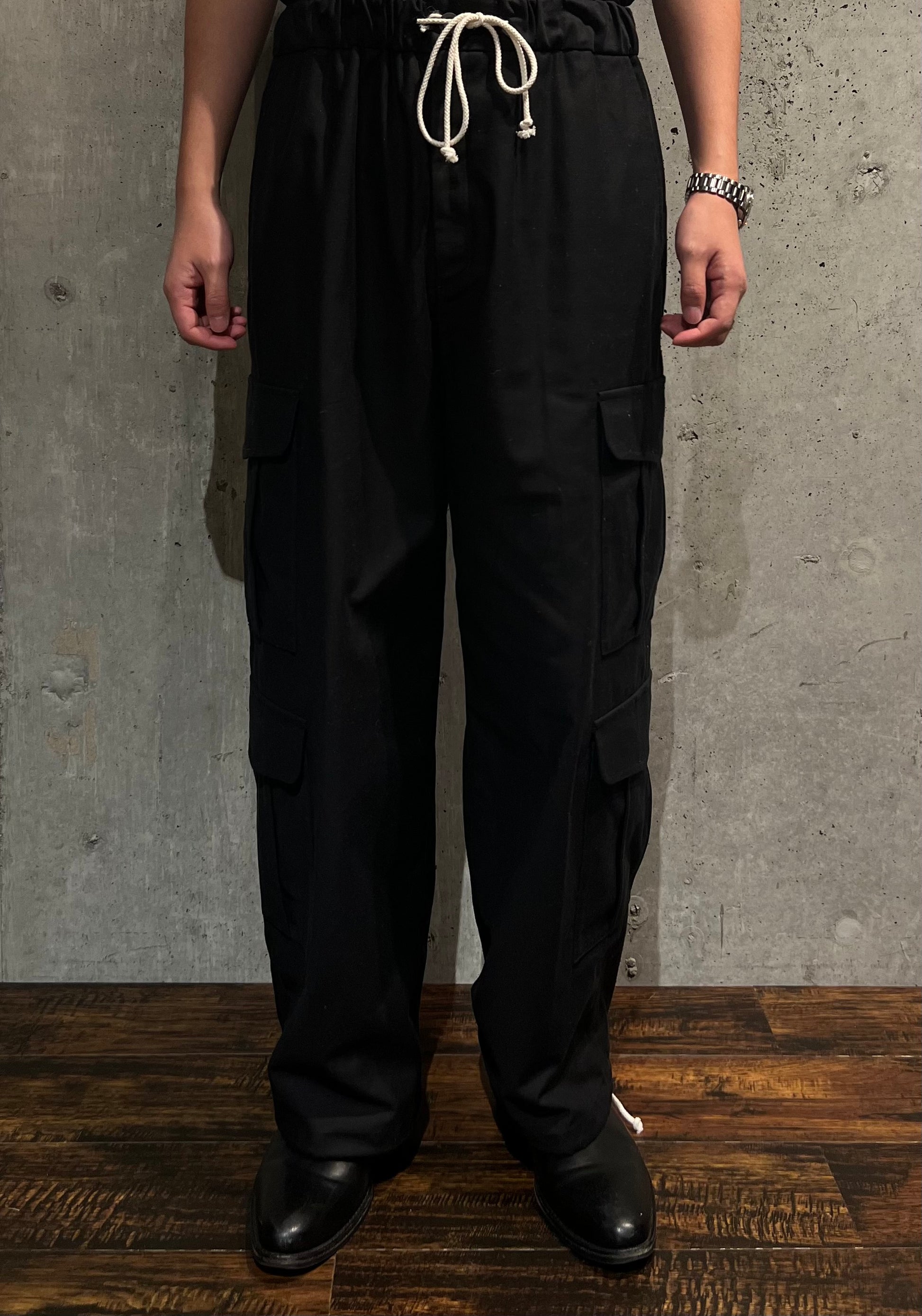 ワイドシルエットのイージーパンツに、サイドの4つカーゴポケットがアクセントとなっています。武骨な雰囲気のままの着用や、裾の絞りを使用したスッキリとした雰囲気での着用が可能な汎用性のある一着です。
