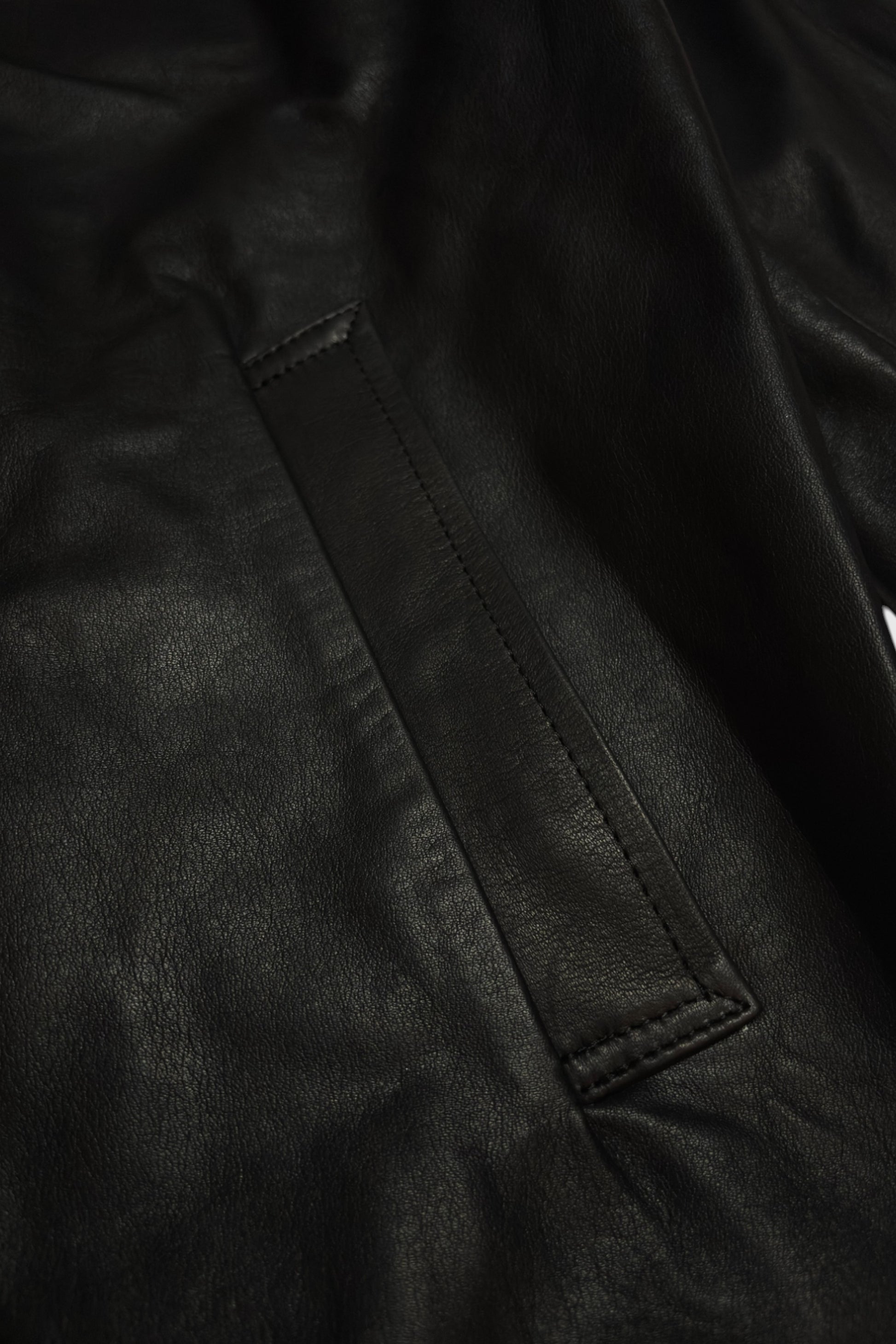 レザーアウター特有の、堅苦しさを払拭したい思いで制作されたルーズなサイズ感のコーチジャケットです。どんな服装の上からでも羽織れるルーズなサイズ感が特徴です。無駄を削ぎ落としたミニマルなデザインとソフトなレザーが相まって、ハードになり過ぎず、気軽に着用出来るアウターです。裾のドローコードでニュアンスの効かせたコーディネートが可能になっています。襟を立てて着用する事も可能です。