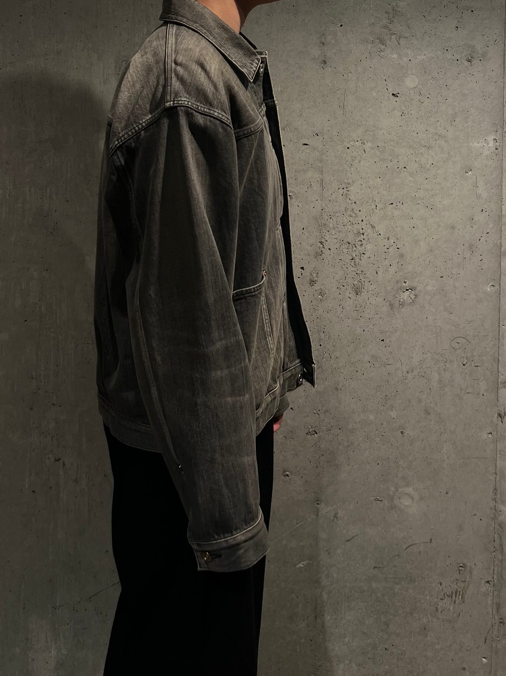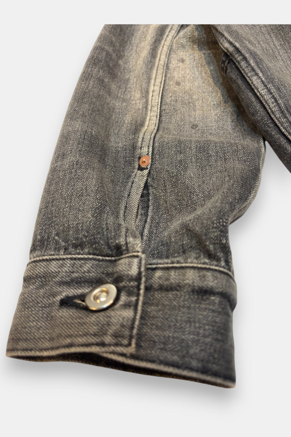 デニムジャケットにカバーオールの大きなポケットが付いたユニークかつ気の利いた便利なデザインです。