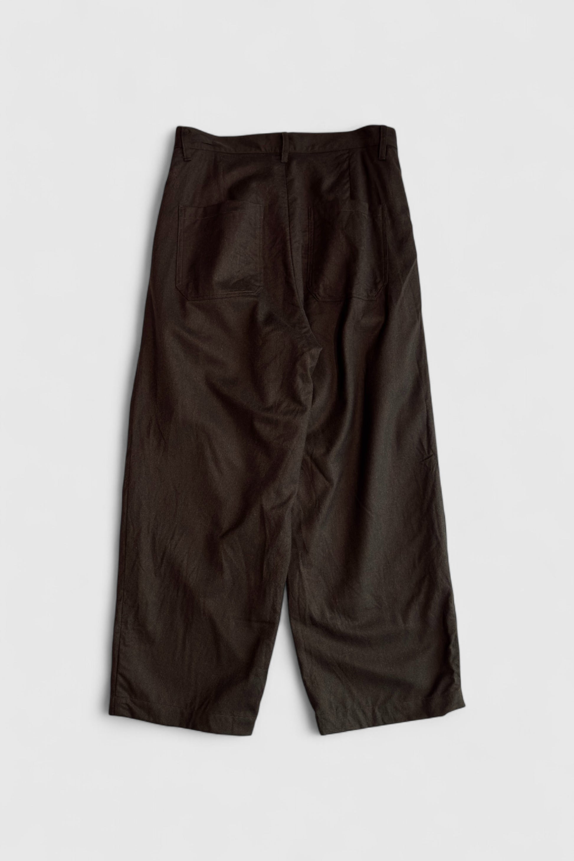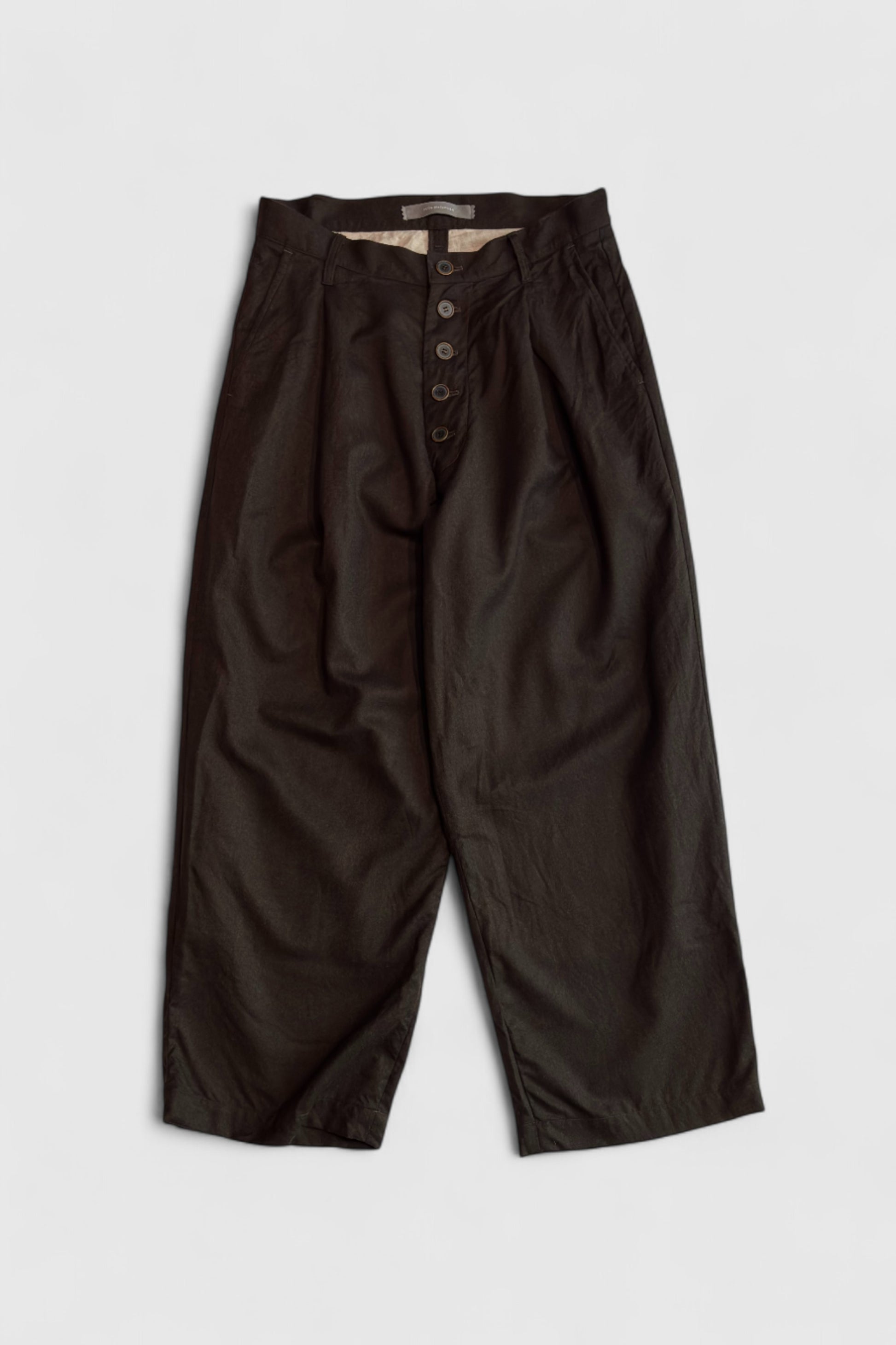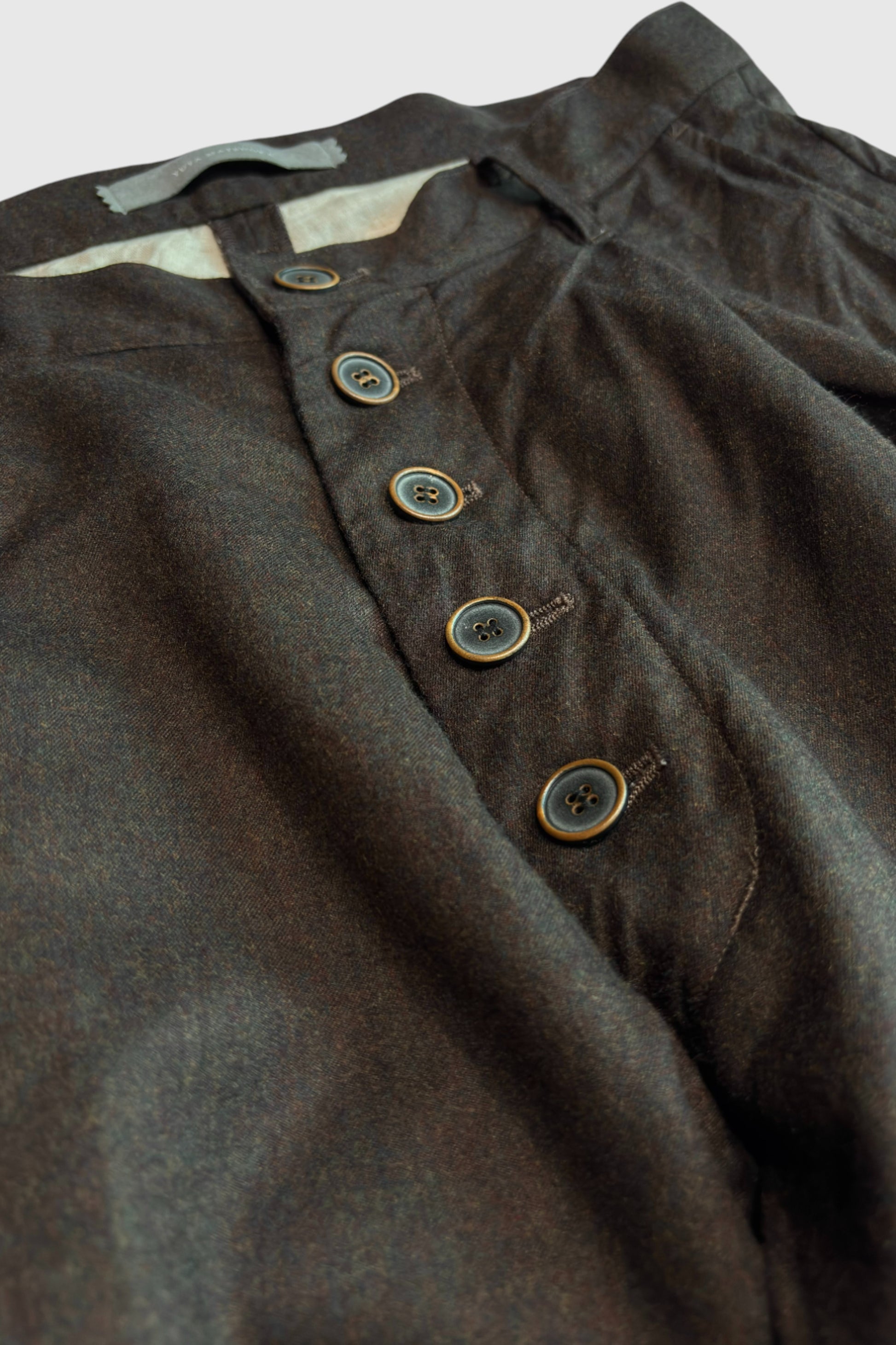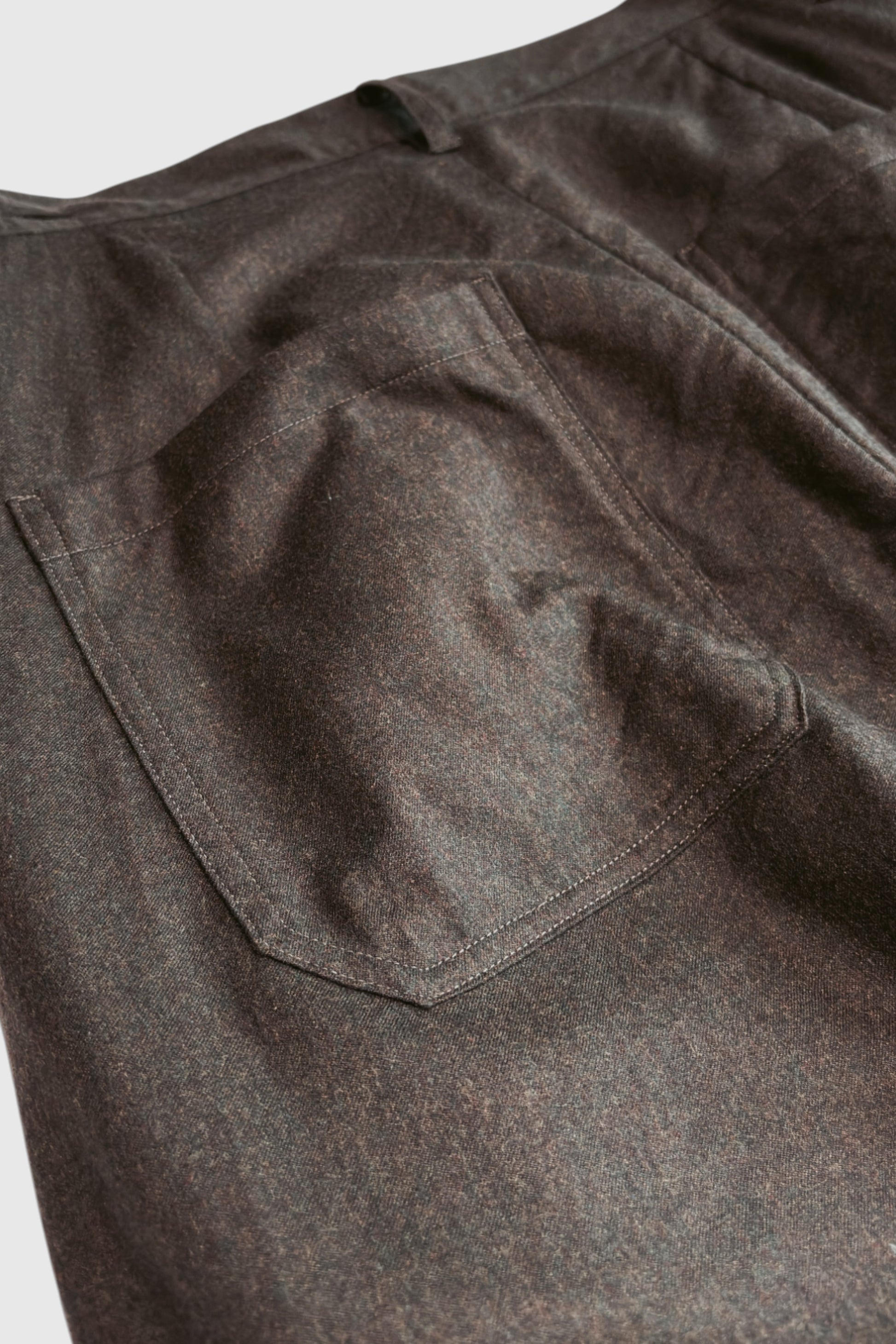 90年代にスーツ地で流行った、何色かの色を混ぜたウールのトップ糸を使用したツイル生地を使用したパンツです。デッドストックの生地で、この糸は今では作ることが出来ないそうです。若干のストレッチ感が特徴で、ドレープ感もあり上品さも兼ね備えています。